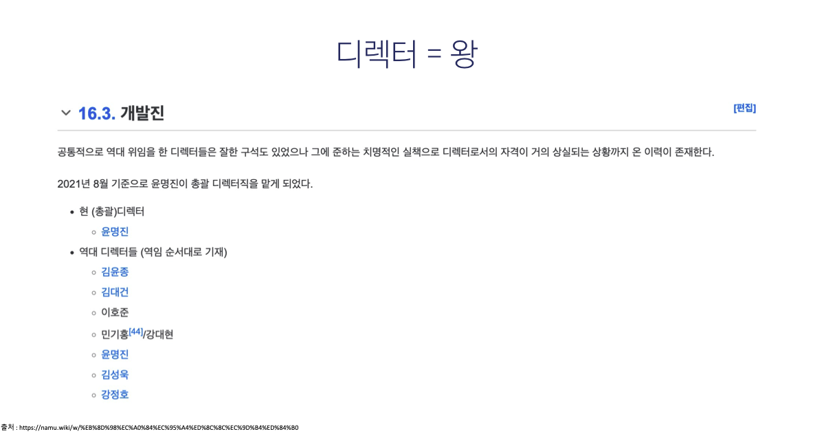 게임은 현실세계의 국가와 가장 비슷한 구조를 가졌다고 합니다. 게임의 제작자인 디렉터는 현실세계에서의 왕과 비슷한 존재라고 하네요. 어떤 사람이 왕이 되느냐에 따라 그 나라의 흥망성쇠가 결정되듯, 디렉터에 따라 게임 내 경제, 캐릭터 등이 모두 바뀌기 때문입니다.