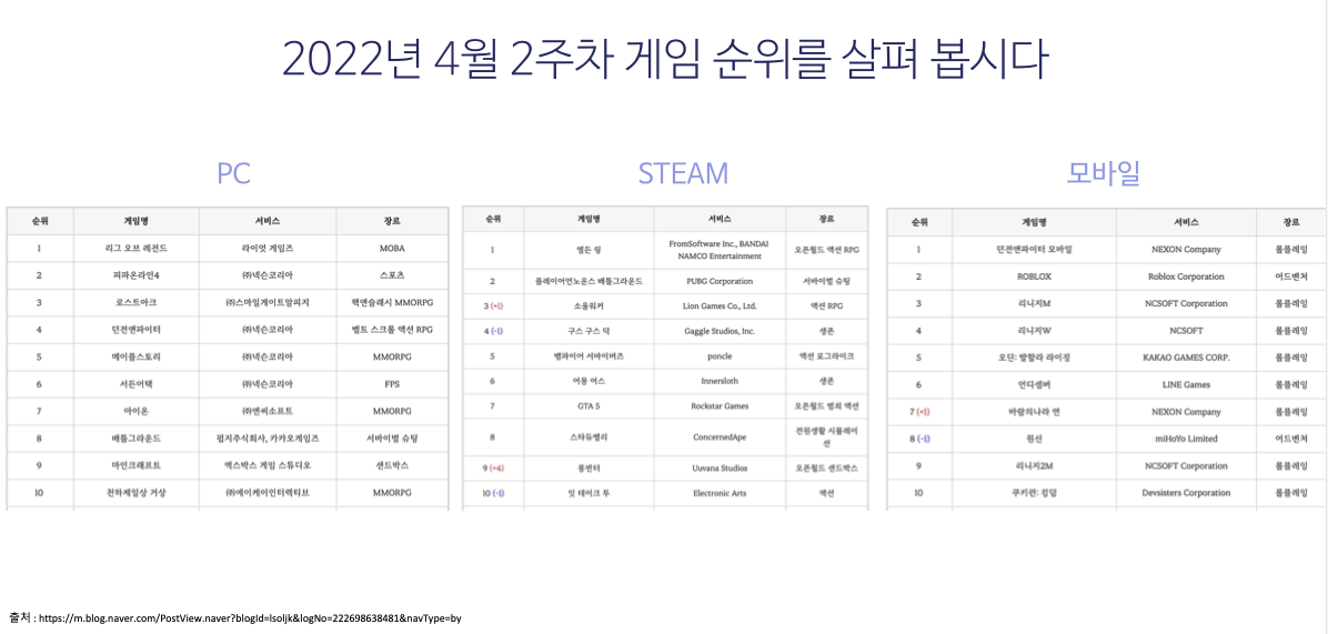 2022년 4월 2주차 게임 순위를 살펴보면 10위까지 랭크 되어 있는 PC 게임들은 대부분 우리가 한 번쯤 들어본 이름의 게임들입니다. 예전부터 유명했던 게임들이 꾸준히 순위권에 자리를 잡고 있는 것이죠. 이만큼 PC 게임은 진입장벽이 높아 새로운 게임이 순위권에 진입하기가 쉽지 않다고 합니다. 그나마 STEAM 게임 쪽은 새로운 인디게임들이 많이 유입되고 있는데요, 어몽어스의 경우 2018년에 제작되었지만 2020년 코로나가 발생하면서 순위가 확 올라갔다고 합니다.