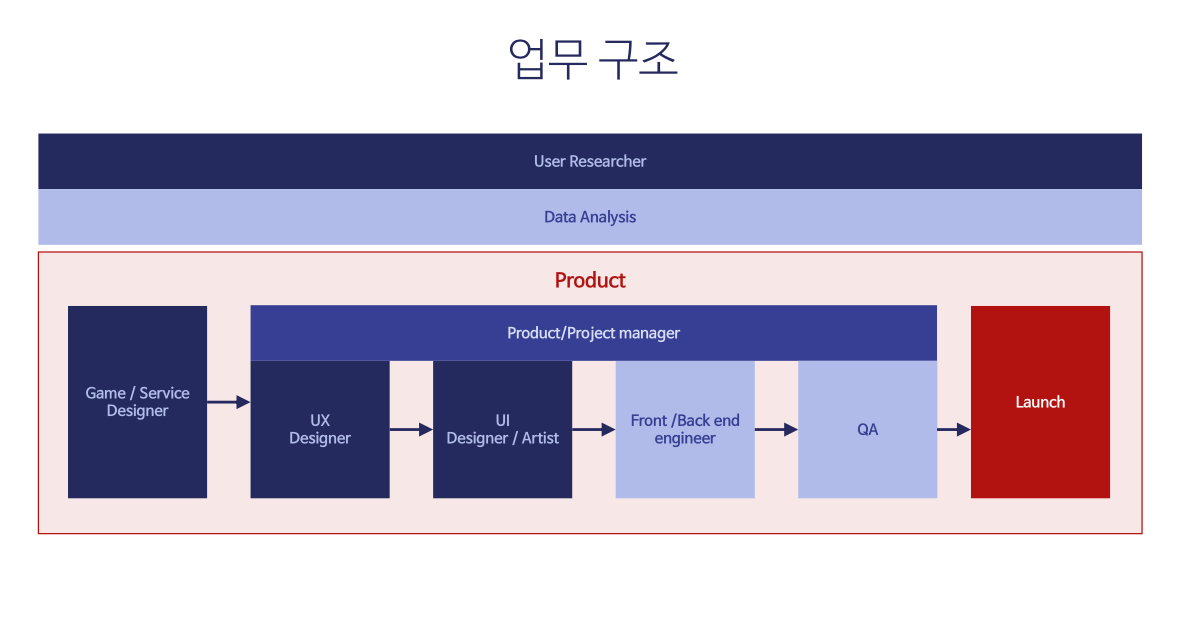 하나의 프로덕트가 출시되는 과정을 차례대로 살펴보면, 우선 게임디자이너나 서비스 디자이너가 현재 서비스 상황을 바탕으로 특정 지표를 개선하거나 유도하기 위한 기획을 합니다. 그 이후에는 UX 디자이너, UI 디자이너, 개발자가 함께 기획서를 검토하고 피드백을 합니다. 해당 피드백을 바탕으로 게임 디자이너나 서비스 디자이너가 기획서를 수정하는 과정을 거치게 됩니다. 이후 개발이 결정되면 언제 런칭할지 일정을 잡고 준비하게 되는데요, 이때 PM들이 상황을 매니징 하며 프로덕션을 진행한다고 합니다.  게임이 완성되면 문제는 없는지 QA가 퀄리티 체크 후에 런칭하게 됩니다. 런칭한 후에도 목표달성을 위해 이 과정을 무한 반복하며 수정과 업데이트를 거친다고 하네요.
