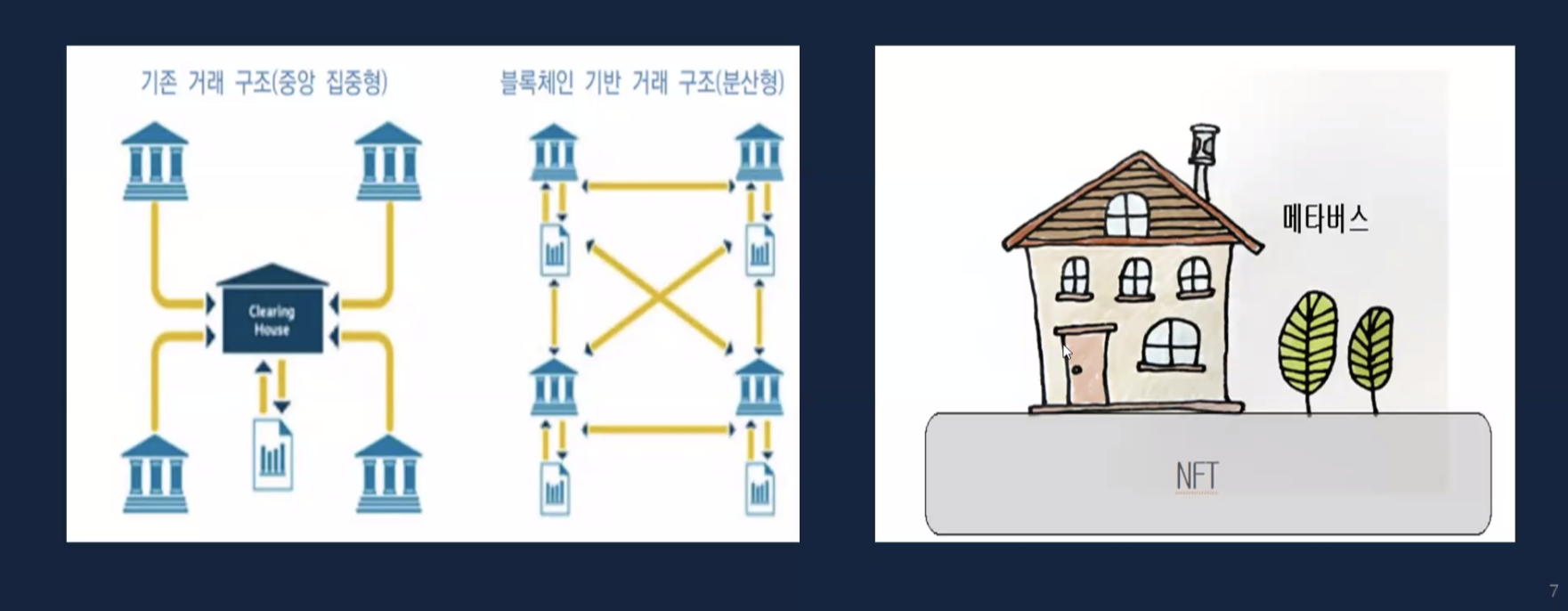 그렇다면 블록체인, 암호화폐, NFT, 메타버스 간의 관계는 어떻게 될까요? 이를 잘 이해하기 위해서는 '탈중앙화' 구조가 등장한 배경을 먼저 짚고 넘어가야 합니다. 기존의 금융, 정보 거래구조는 중앙 집중형이었습니다. 중앙에서 거래를 총괄하는 은행, 서버 등등을 말합니다. 이런 중앙집중형 구조는 마음먹기에 따라 해킹이나 조작의 여지가 있습니다.