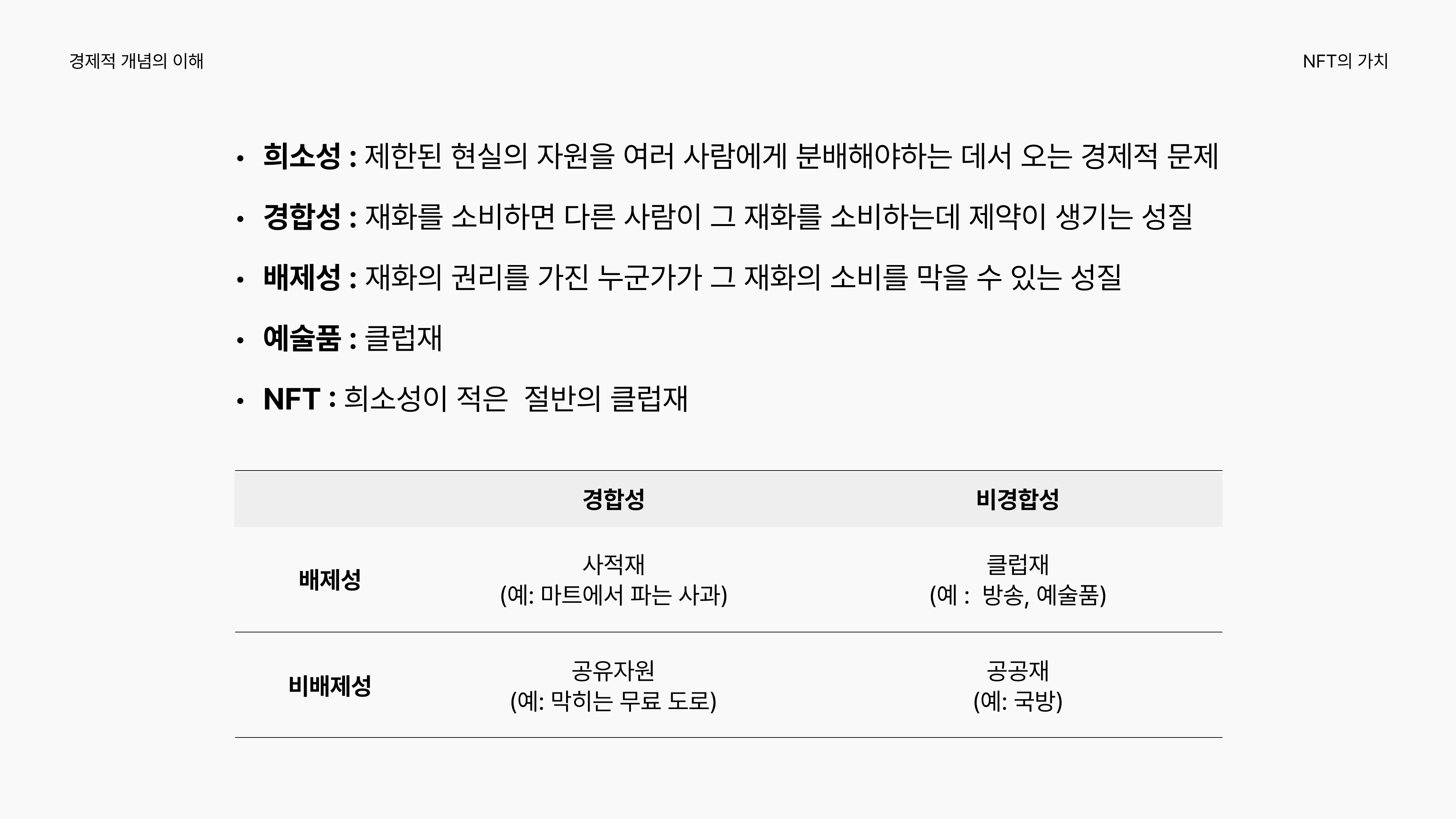 NFT로 거래된 디지털 자산은 누군가 사용한 후에도 다른 사람이 사용 가능하므로 비경합성을 지닙니다. 한편, 개별 NFT 토큰 자체는 블록체인 상에 하나밖에 존재할 수 없으므로 소유에 대한 배제성이 있습니다. 그러나 소유권 구매와 별개로 작품 자체는 복사가 가능하며 소유자 외의 사람들도 소비할 수 있으므로(그렇지 않을 수도 있지만) 배제성과 비배제성 사이에 존재합니다. 따라서 NFT 작품은 ‘클럽재’와 ‘공공재’의 중간 성격을 띄게 됩니다.