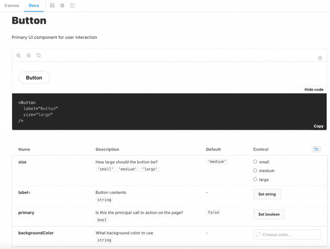 설치를 하면 작업해둔 코드를 바탕으로 해당 컴포넌트의 각 상태별 코드를 show/hide code 버튼을 통해 파일을 굳이 찾아들어가지 않아도 바로 확인하여 작업 가능하며, 어떤 옵션 값들이 있는지 테이블로 설명이 되어있어 협업 시 유용하게 사용 가능합니다.