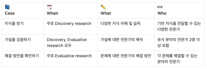 ➔ 사용자 조사를 통해서 문제을 다각도로 파악했는데 어떤 방향으로 해결하면 좋을지에 대해 확신이 없거나 의견이 분분할 때가 있습니다. 이럴 때 전문가 인터뷰를 통해 해결 방향의 초점을 맞출 수 있습니다.