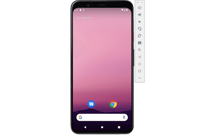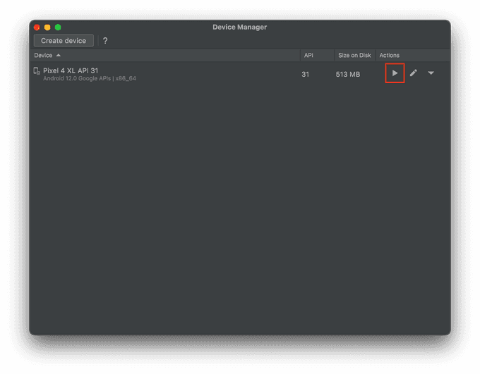 여기서 실행하려고 하는 Device 리스트의 > 버튼을 클릭하면 에뮬레이터가 실행되게 된다.