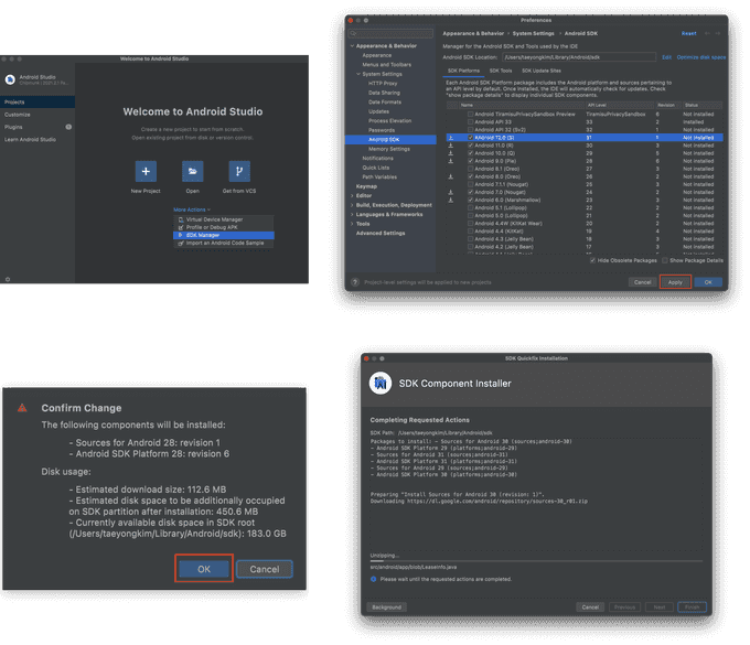 - 설치하고 싶은 Android 버전을 선택 후 Apply 선택하면 뜨는 확인 창에서 OK를 누르면 다운로드가 진행된다.