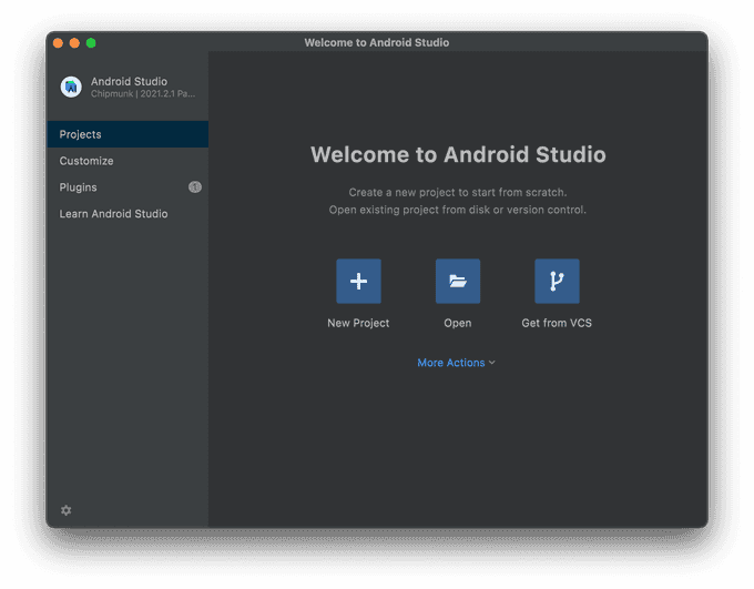 설치가 완료되면 Android Studio의 웰컴 화면이 등장하게 된다.