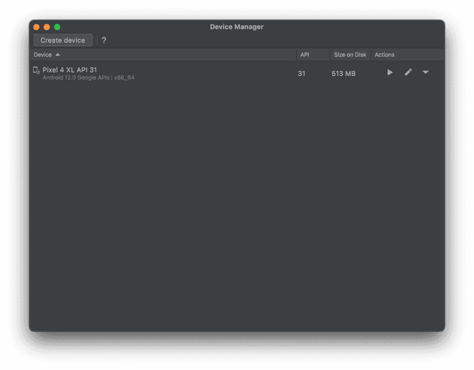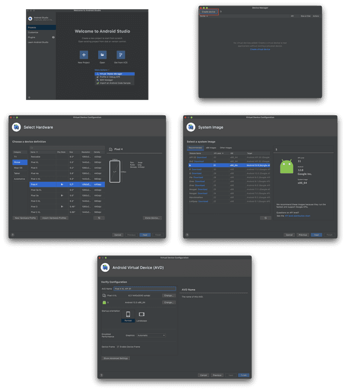 - 웰컴 화면에서 More Actions의 Virtual Devices Manager 실행