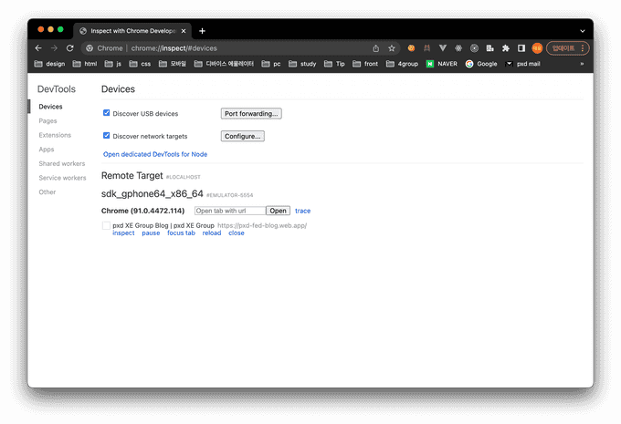 에뮬레이터를 실행한 PC에서 크롬을 실행한 뒤 주소창에 chrome://inspect/를 입력 후 접속해보면 아래와 같은 화면이 나오게 된다.