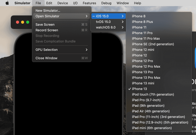 만약 다른 OS 버전 및 기종을 확인하고 싶다면 File 메뉴의 Open Simulator에서 원하는 OS 버전의 기종으로 Simulator를 실행할 수 있다.