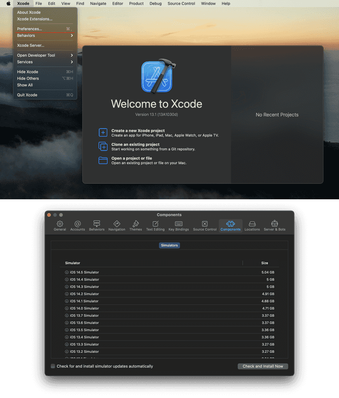Xcode 메뉴의 Preferences를 누르면 나오는 창에서 Components 탭을 눌러보면 필요한 OS를 내려받을 수 있다.