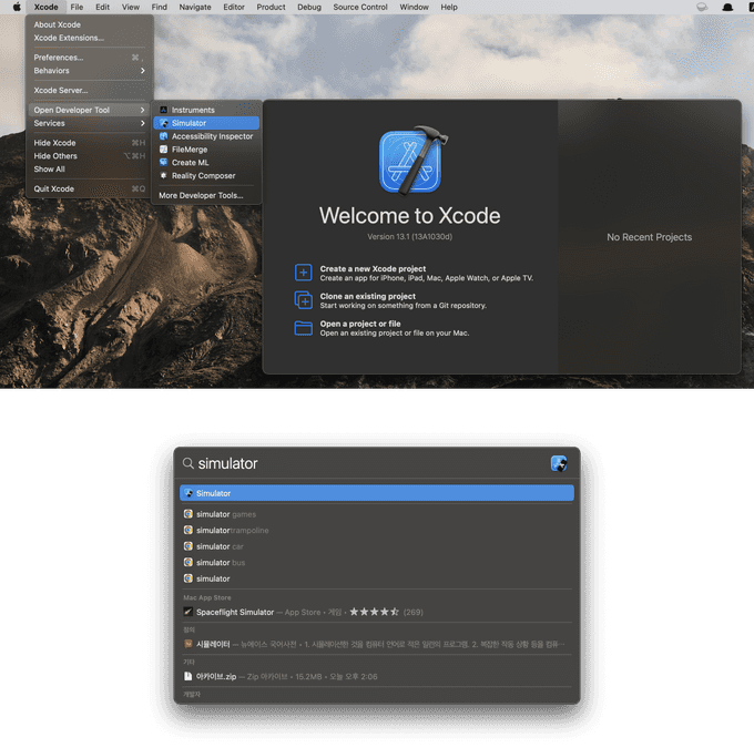 그런 뒤 Xcode 메뉴의 Open Developer Tool에서 Simulator를 실행하거나, Mac의 Spotlight에서 Simulator를 실행하면 iOS 시뮬레이터가 실행된다.