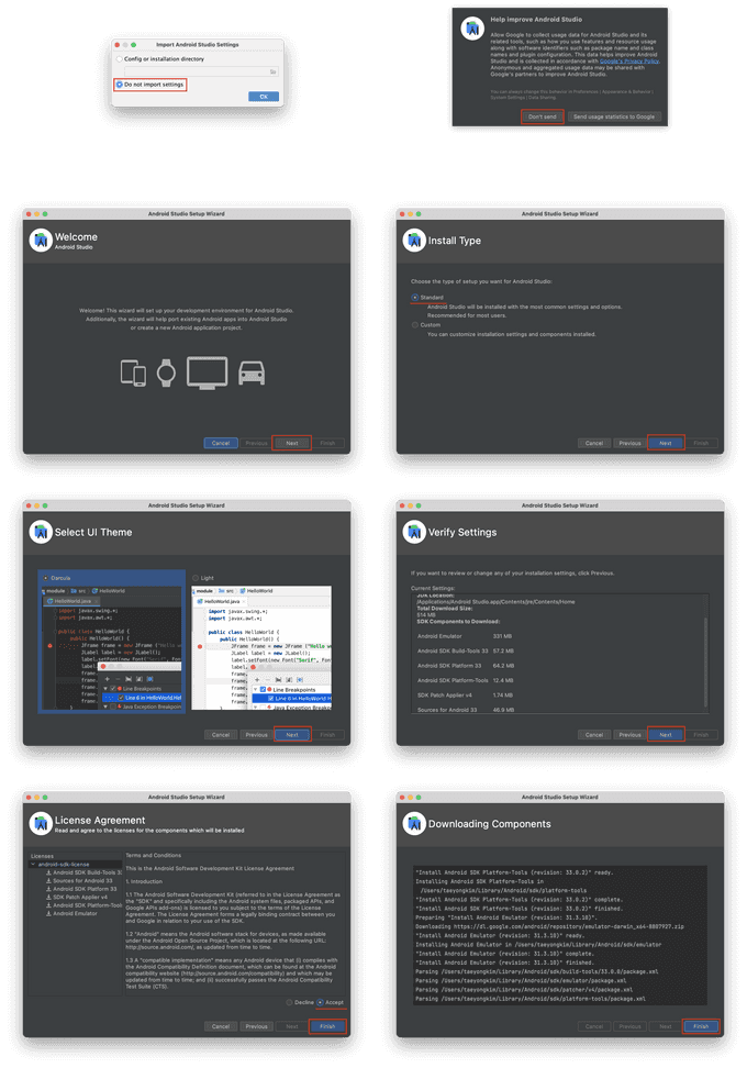 - Android Studio Wizard 화면은 전부 기본값으로 실행(테마는 취향에 맞는 걸 선택하자)
