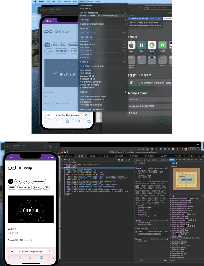 사파리를 실행하여 개발자용 메뉴에서 시뮬레이터를 선택할 수 있고, 이를 눌러주면 끝.