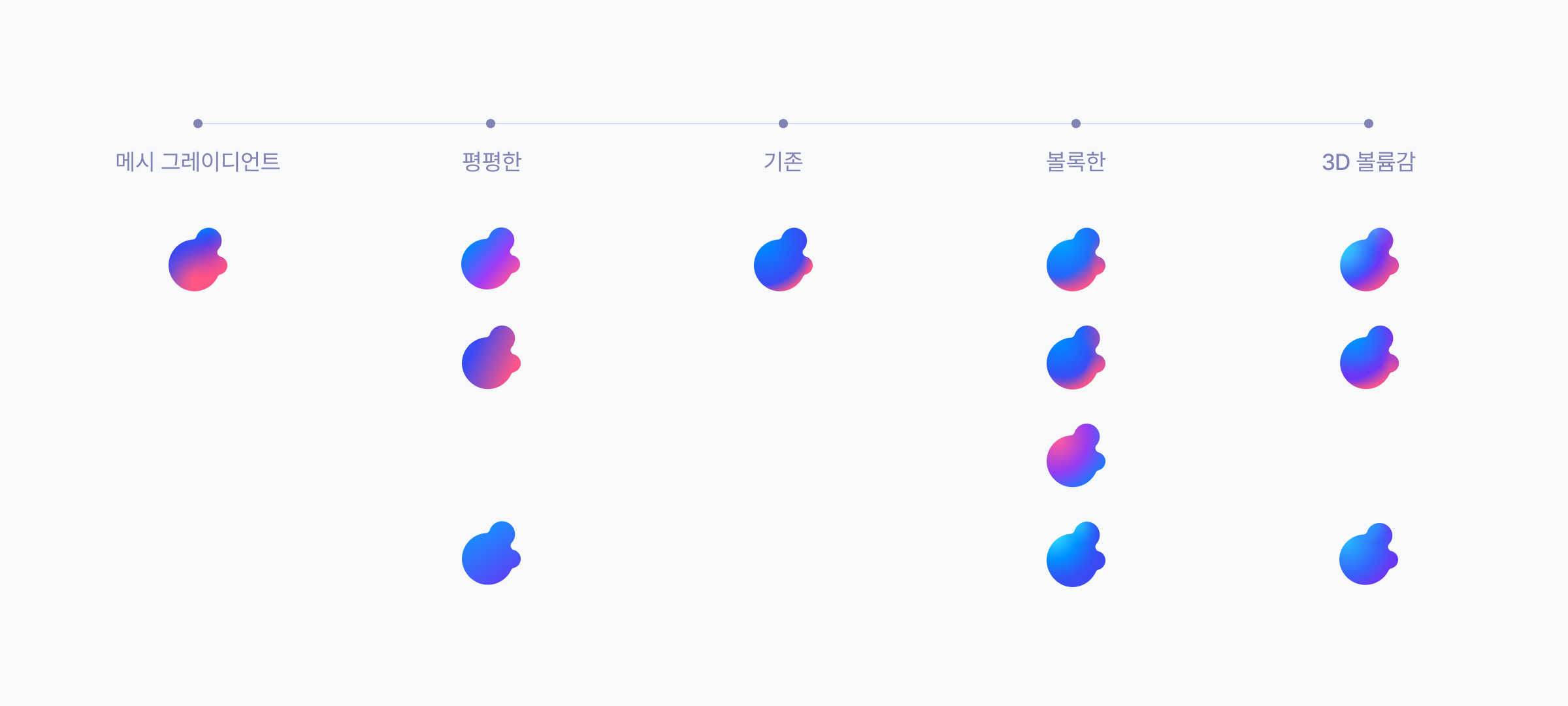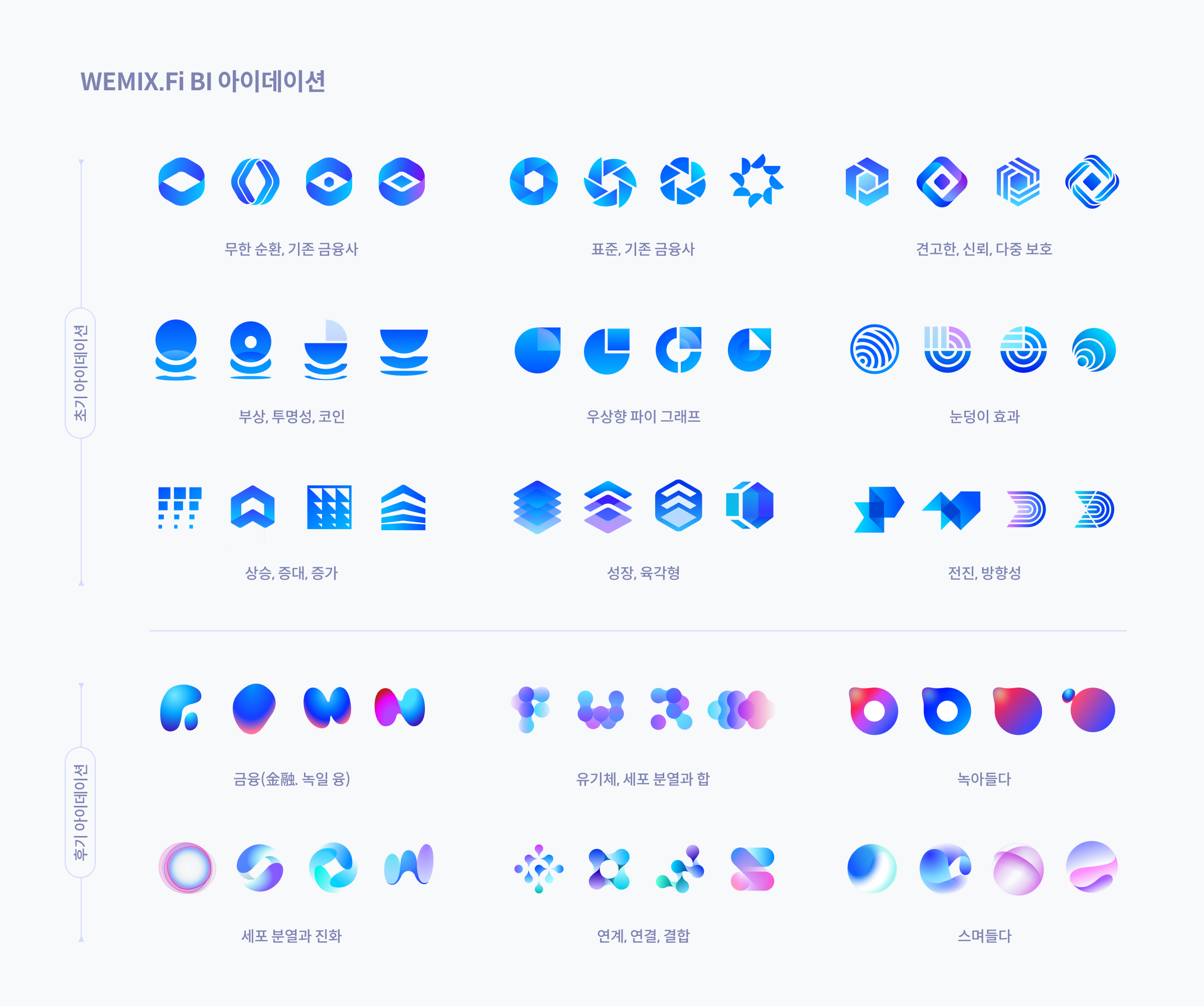 하지만 기존의 것을 차용한 형태는 WEMIX.Fi의 가치를 표현하는 데에 한계가 있었습니다. 최적의 심벌을 찾기 위해 시각과 생각을 바꿔야만 했죠. 순환, 상승, 증가를 함의한 기하학 형태가 아닌 유기적인 형태를 찾기로 했습니다. 초반 작업에 참고했던 자료들을 모조리 버리고, 당시에는 필요하지 않았던 자료들을 다시 들여다봤습니다.그 과정에서 확장과 성장, 변화와 변환, 융합, 비정형, 무한한 가능성 등의 단어가 떠오른 것은 어찌보면 자연스러운 일이었습니다. 전부 WEMIX.Fi를 정의할 수 있는 또 다른 표현이니까요.
