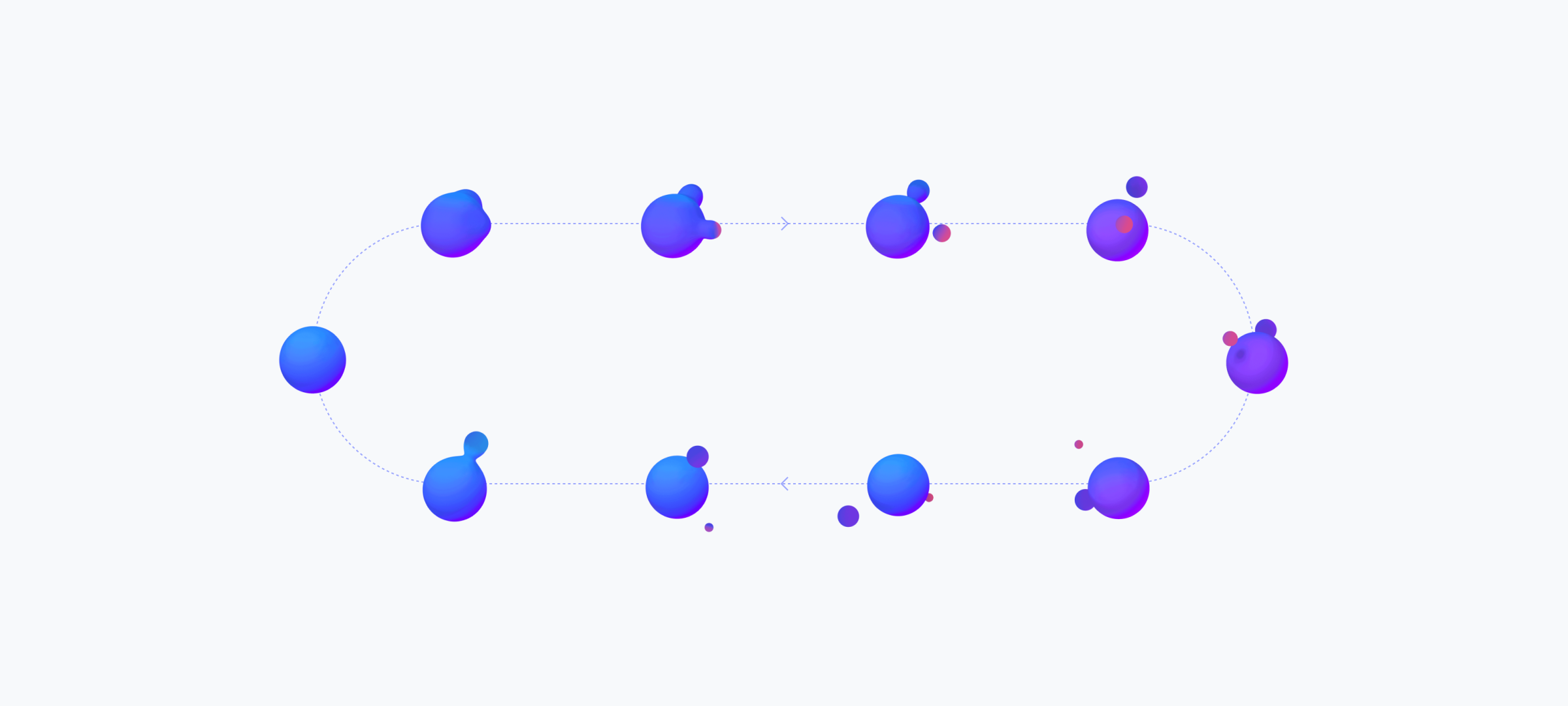 브랜드의 얼굴인 로고부터 살펴볼까요? 파란색 원이 하나 보입니다. 그러다 이내 모션이 더해지며 형태와 색이 바뀌죠. 파란색 구체에서 두 개의 작은 구체가 튀어 나와 주변을 빠르게 돌더니 다시 큰 구체 안으로 들어갑니다. 색도 변합니다. 파란색에 분홍빛과 보라빛이 감돌며 작은 구체의 존재와 움직임을 부각시키죠. 로고의 형상은 순식간에 1차원에서 3차원으로 바뀝니다.