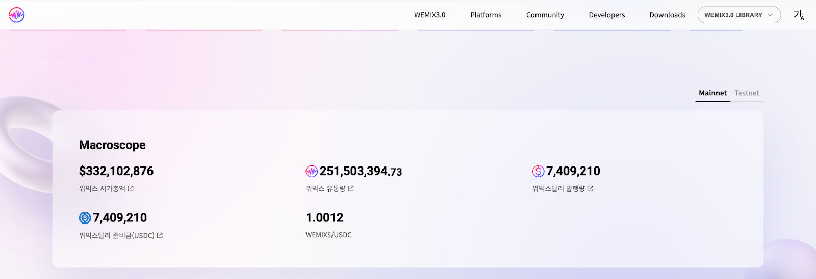 WEMIX는 시가 총액(Market cap), 순환 공급량(Circulating Supply), 코인의 가격(WEMIX$/USDC)과 같은 Macro 정보부터 블록 수(Total Blocks), 가스비(Gas Fee)와 같은 Micro 정보에 걸쳐 네트워크 전반의 정보를 정확하게 전달해 브랜드 사이트로서의 신뢰도를 확보합니다.