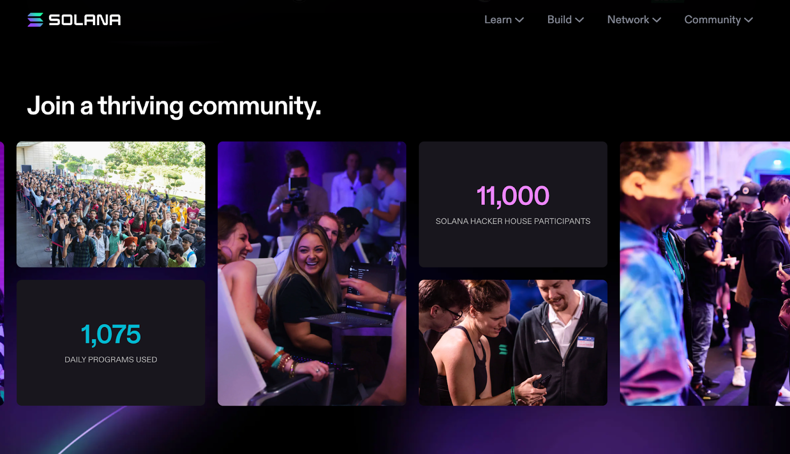 네트워크 참여자의 활동량은 정량적인 수치로 전달할 수도 있지만, 현장 사진도 함께 보여줄 수 있습니다. Solana는 다양한 Hackathon, Meet-up과 같은 오프라인 이벤트를 운영하고 참여자의 활동성 지표와 이벤트 현장 사진을 함께 제공합니다. 이는 활동성 수치를 더 생동감 있게 전달한 대표적인 사례입니다.