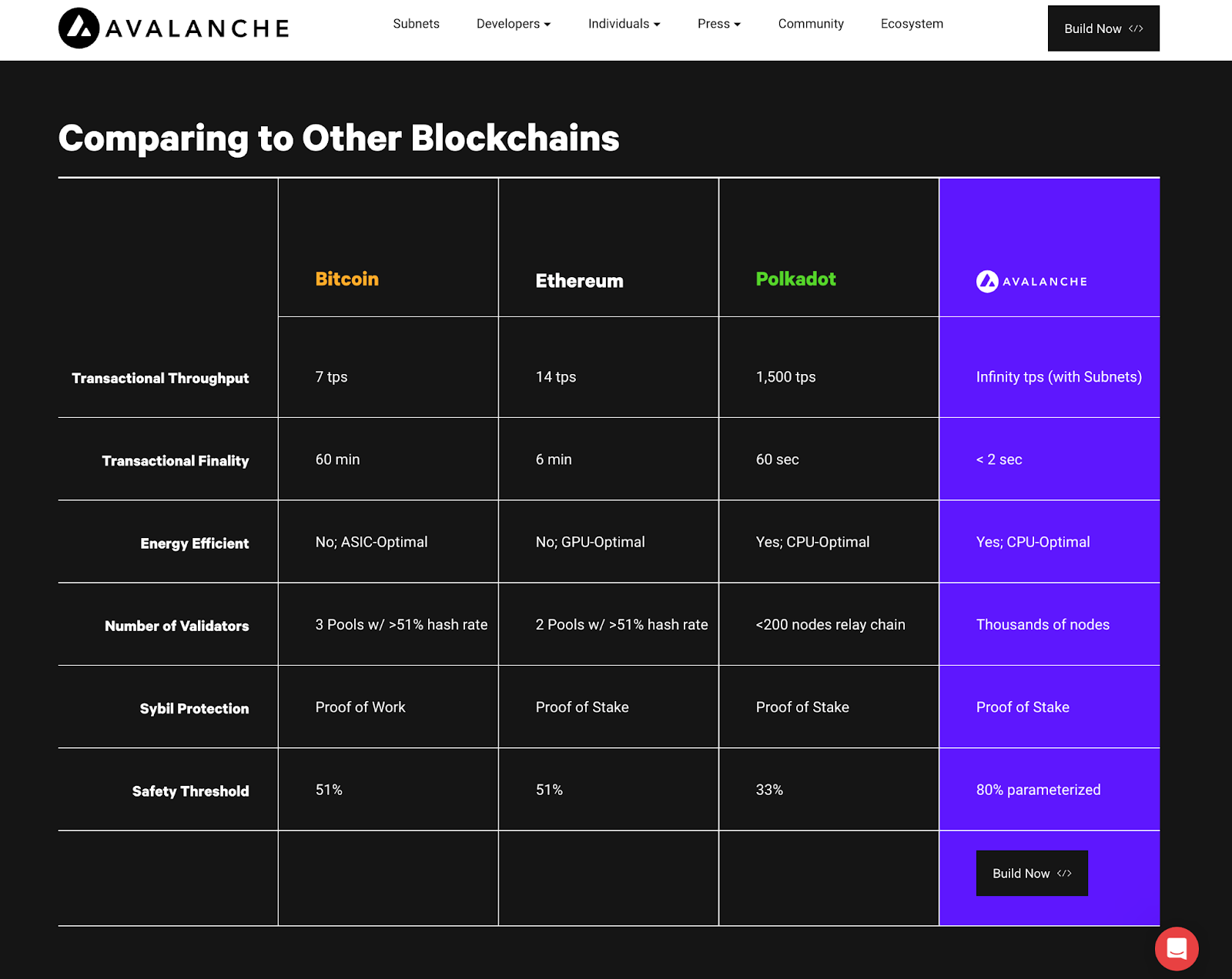 Avalanche의 경우 Transaction 소요 시간, 에너지 효율성, 증명방식 등 네트워크의 성능 지표를 전달합니다. 또한, 이를 Bitcoin, Ethereum, Polkadot과 같은 경쟁사의 지표와 비교해 제공하는데요. 이는 신규 사용자가 Avalanche 네트워크의 효율성을 쉽게 이해하고, 성능을 강조하는 사례로 볼 수 있습니다.