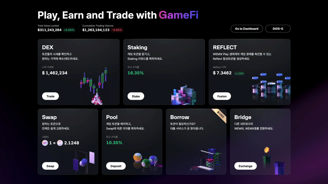 GameFi는 게임(Game)과 DeFi(Decentralized Finance, 탈중앙화된 금융)를 합친 개념입니다. DeFi란 블록체인 기술을 활용한 금융 서비스를 가리키는데요. GameFi는 게임을 하다 보면 자연스럽게 축적되는 게임 내 자산으로 다양한 DeFi를 이용할 수 있게 합니다. WEMIX PLAY에 온보딩된 게임들의 제각기 다른 코인을 통합적으로 운용할 수 있는 서비스죠.