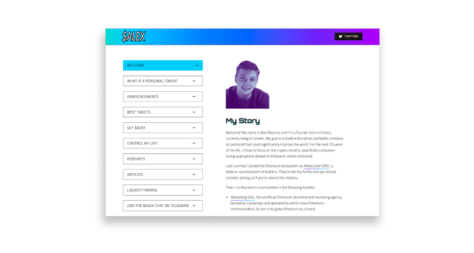 Alex Masmej는 크립토 씬에서 활동하고 있는 사업가입니다. 블록체인과 관련된 다양한 활동을 벌인 Alex는 자신의 다음 프로젝트를 샌프란시스코에서 시작하려 했으나 코로나19로 인해 수입이 없어지는 상황에 부닥칩니다. 이에 Alex는 이주 및 창업 자금을 마련하기 위해 개인적으로 발행한 $ALEX를 판매하는 실험적인 시도를 합니다. 토큰 구매자에게 향후 3년 동안 10만 달러 한도 내에서 자신이 벌어들이는 수익의 15%를 토큰 보유량에 따라 차등을 둬 나눌 것을 약속하면서 말이죠. 실험은 불과 100여 시간 만에 2만 달러 상당의 토큰을 판매하며 성공을 거둡니다. 이후 Alex는 월간 뉴스레터를 발행하거나 프라이빗 텔레그램 그룹에 대한 참여 권한을 주는 등 토큰 구매자들을 대상으로 한 혜택을 추가합니다. 더불어 한 달 동안 ‘매일 5km 조깅하기' ‘고기 섭취 금지' ‘6시 기상' 등과 같이 자신의 일상과 관련된 항목에 홀더들이 의사 결정을 대신하도록 투표를 진행하며 토큰 유틸리티 확장을 해보기도 했습니다.