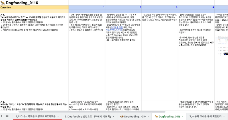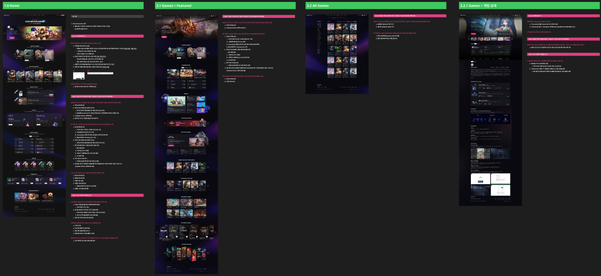 이후, 2개의 팀을 이루어 좀 더 구체적으로 개선안을 정리해 보는 시간이 있었는데요, 저는 이 단계가 팀원들에게 도그푸딩이 할만한 액티비티구나...라고 생각하게끔 만든 영향을 끼쳤다고 생각합니다. 그 이유는 세가지인데요, 1) 내 생각과 다른 팀원들의 생각을 들어볼 수 있다는 점, 그리고 2) 화면의 완성도에 집중하느라 못 보고 있었던 플랫폼을 관통하는 시나리오를 생각해 볼 수 있었다는 점, 3) 그리고 함께 이야기를 나눈다는 것입니다. 화면 단위, 모듈 단위로 업무가 진행되면 진행하는 모듈 외의 부분에 대해서는 이해도가 더 낮아지고 프로덕트의 큰 그림을 보기 어려울 수도 있습니다. 예를 들어 게임을 담당하는 사람이 GameFi(게임을 이용한 블록체인 금융 서비스)를 제대로 알기 어렵고, GameFi를 담당하는 사람이 NFT에 대해서 알기 어렵습니다. 이 상황에서 전체 화면을 나열해 보고 도그푸딩으로 제시했던 시나리오가 잘 연결될지 확인하는 과정은 프로덕트를 객관적으로 경험하는데 큰 도움을 되었습니다. 또, 당시 거의 모든 업무가 재택으로 진행된 가운데 왁자지껄 자유롭게 이야기를 나눌 수 있는 분위기를 오랜만에 맞이한 것도 도그푸딩이 긍정적이라고 느낀 데에 한몫했을 것 같습니다.