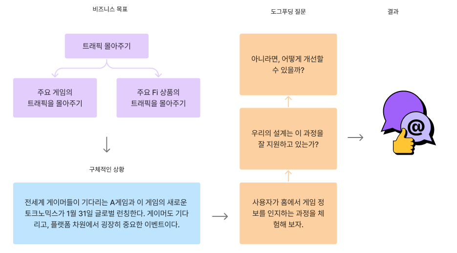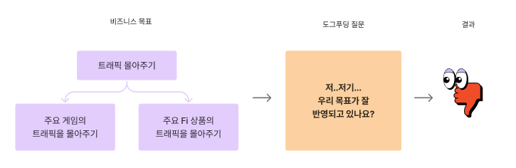 앞서 말씀드렸듯이 이번 도그푸딩의 목표는 “우리는 프로덕트의 비즈니스 목표에 맞게 디자인하고 있는가"를 점검하는 것이었습니다. 그러기 위해, 비즈니스 목표를 이해하는 것이 선행되어야 했는데요, 처음에는 이 점을 간과하여 역시 시행착오가 따랐습니다.