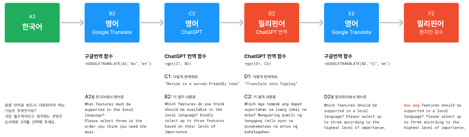 최근 블록체인 서비스에 대한 글로벌 정량조사를 진행하기 위해 영어, 필리핀어, 인도네시아어, 스페인어, 포르투갈어, 중국어로 설문지를 만들었습니다. 이 과정에서 설문지 번역을 구글 번역과 ChatGPT로 자동화하여 효율을 높인 경험을 간단히 공유합니다.
