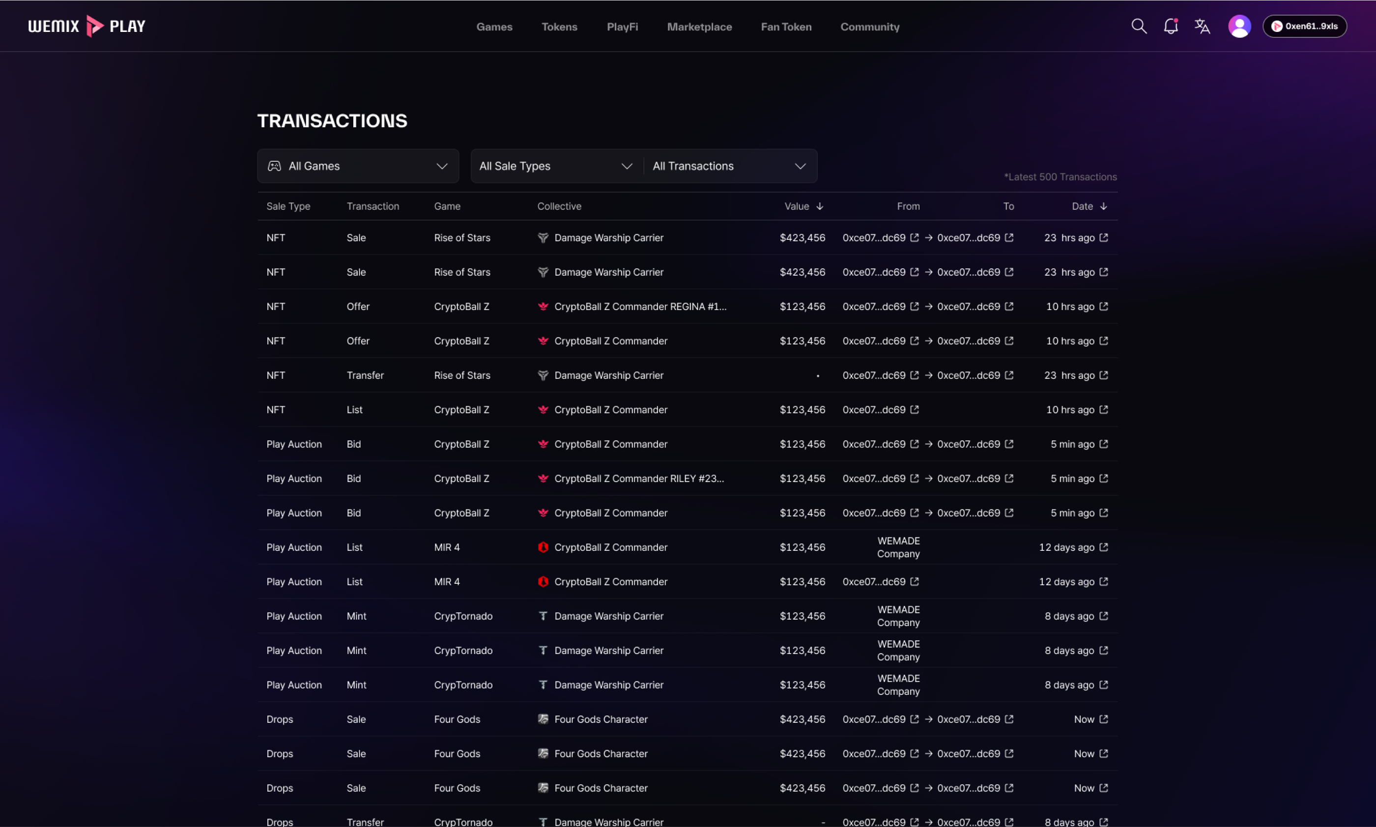 Marketplace(마켓플레이스)는 WEMIX PLAY에 온보딩한 게임 NFT(Non-Fungible Token)를 거래하는 '장터'라고 할 수 있습니다. Marketplace를 새로운 장이라 일컬을 때, 누군가는 "게임 캐릭터나 아이템은 예전부터 거래할 수 있었고 NFT 마켓도 이미 여럿 있는데, 새삼 뭐가 새롭다는 거지?"라고 반문할지도 모릅니다. Marketplace의 참신성은 게임과 NFT, 두 요소의 융합으로부터 비롯됩니다. 기존 원자들이 결합해 완전히 새로운 분자를 이루듯, Marketplace는 게임과 NFT를 통해서 전에 없던 가능성을 펼치고 있죠.