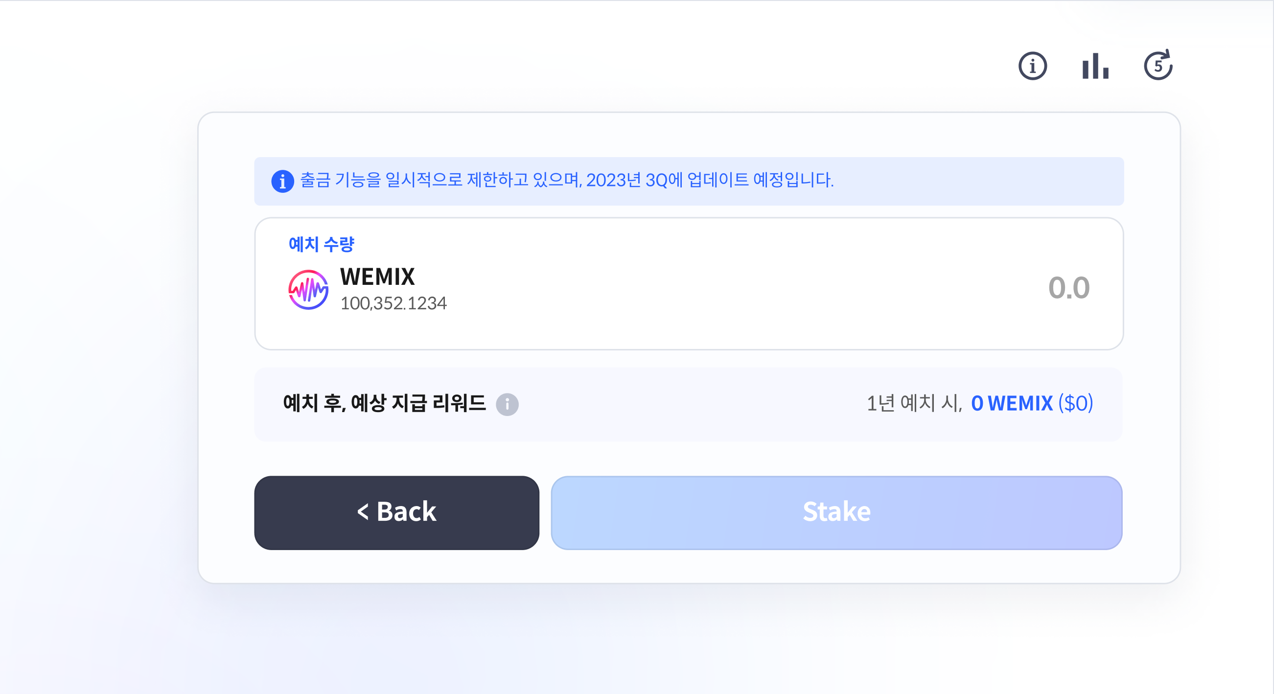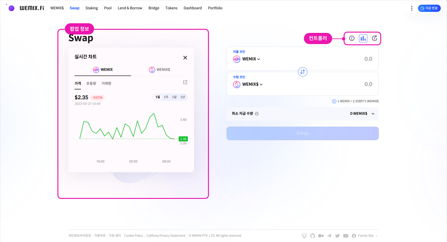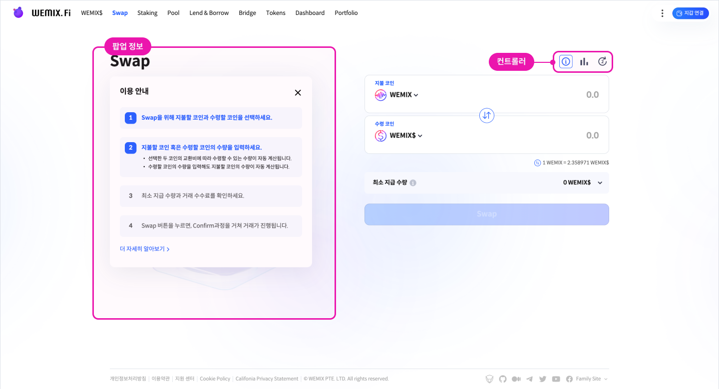 경험의 일관성 측면에서 특정 기능이 동일한 영역에 나타나는 것은 중요합니다. 이용자가 서비스나 상품을 옮겨가도 동일한 경험을 제공받을 수 있기 때문입니다. WEMIX.Fi는 액션 영역의 상단에 고정적으로 위치한 컨트롤러(아이콘)를 통해 스텝 가이드, 차트 등과 같은 부가적인 정보를 획득할 수 있습니다. 이용자가 액션을 지속하면서도 컨트롤러를 누르면 안내 영역에서 팝업된 정보들을 볼 수 있는 것이죠. 필요한 정보가 눈에 잘 띄는, 하지만 액션을 방해하지 않는 위치에 일관적으로 제공됨에 따라 이용자는 어떤 WEMIX.Fi의 어떤 서비스 화면에서든 일관적인 경험을 보장받습니다.