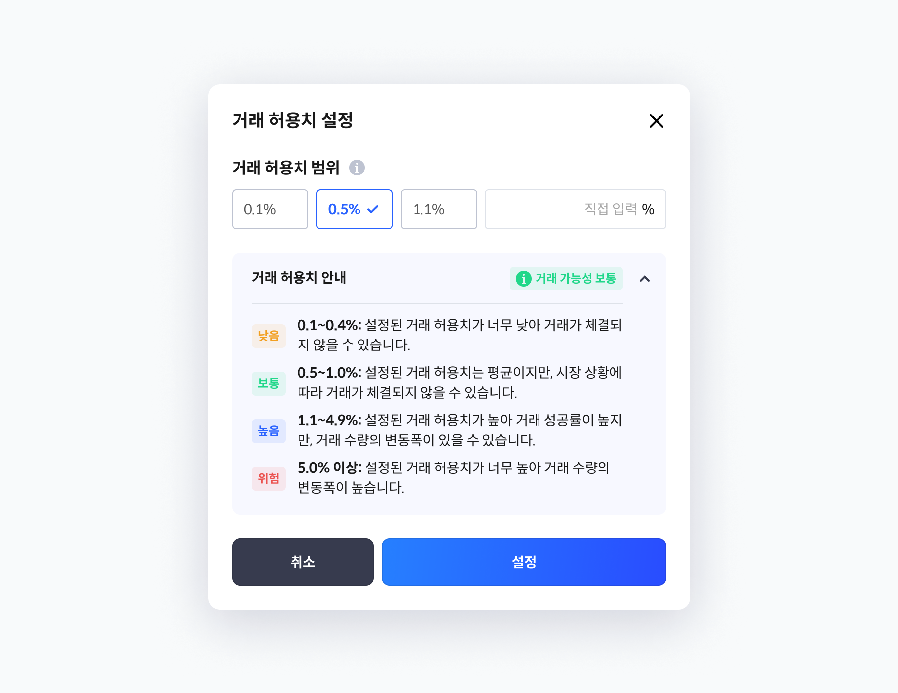 예를 들어, Slippage(슬리피지)는 내가 체결한 가격과 실제 거래 체결 시점의 시세 차이를 어느 정도까지 허용할 것인지 설정하는 기능입니다. 시세 폭이 빠르게 변동하는 코인 시장에서, 시세 차이로 인한 손해를 줄일 수 있는 Slippage는 매우 중요하지만, 코인 시장의 특성을 알아야만 이해할 수 있는 복잡한 개념이기도 합니다.