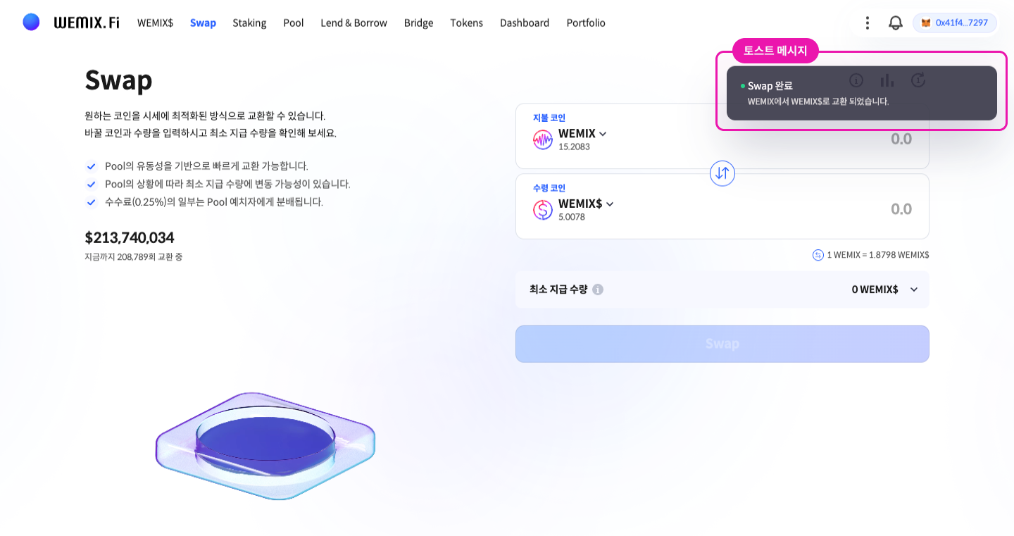 거래 승인 및 완료 이후에는 즉시 결과값이 담긴 토스트 메시지를 제공합니다. 이러한 거래 결과는 Account 패널 ‘거래내역’에서도 수시로 볼 수 있죠. 상품별로 어떤 액션을 진행했는지, 어떤 토큰이 얼마만큼 거래됐는지 등 이용자의 액션에 따른 상태 정보를 즉각 확인할 수 있습니다.