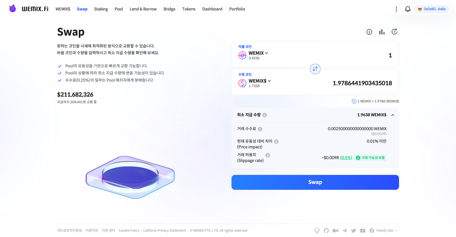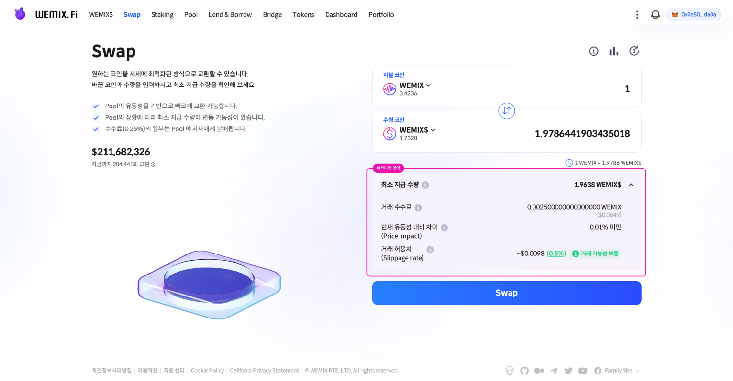 Swap의 경우, 상단 영역에는 앞서 입력했던 내용과 그에 따른 결과, 하단 영역에는 거래 직후 지갑에 표시될 결과의 예상치를 제공합니다. 이를 통해 WEMIX.Fi는 이용자가 거래가 반영된 미래의 자산 상황까지 고려해 액션을 이어갈 수 있도록 합니다.
