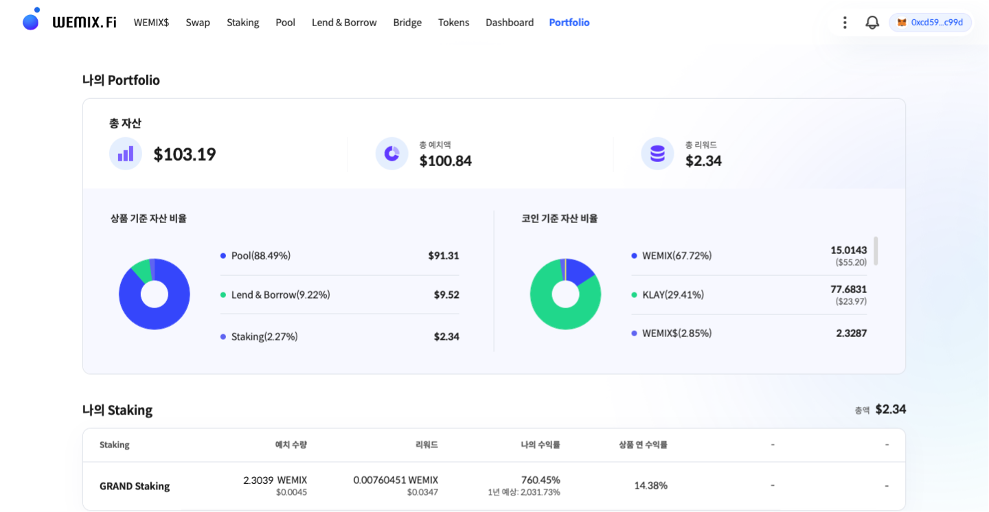 WEMIX.Fi는 Portfolio를 통해 이용자가 자산 현황을 직관적으로 확인할 수 있도록 합니다. 총자산을 확인하는 영역은 ‘상품 기준’과 ‘코인 기준’으로 나뉘어 있는데요. 이는 현재 자산이 어떤 서비스를 통해 운용되고 있는지와 함께, 자산을 구성하는 코인의 시세를 보여줍니다.
