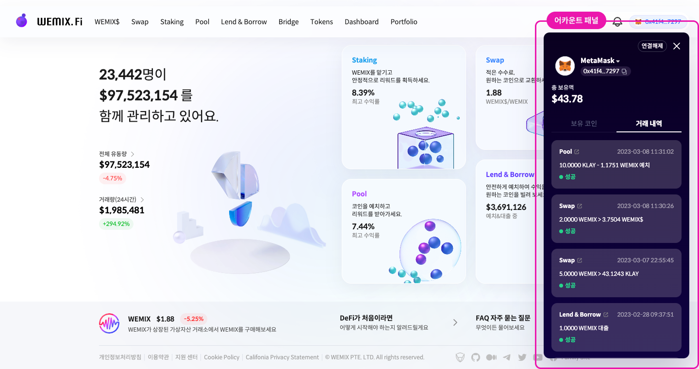 WEMIX.Fi는 거래 진행부터 결과 확인까지 모든 과정을 플랫폼 내에서 하나로 연결함으로써, 이용자가 익스텐션 지갑 히스토리, 이더스캔 등 플랫폼 외부로 이동해 거래 결과를 확인해야만 하는 기존 DeFi 서비스의 불편을 해소합니다.