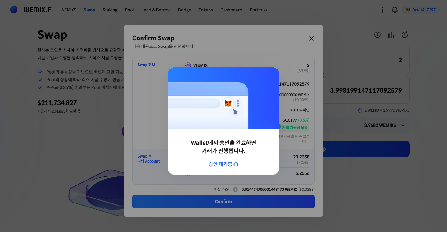 Swap의 경우, 상단 영역에는 앞서 입력했던 내용과 그에 따른 결과, 하단 영역에는 거래 직후 지갑에 표시될 결과의 예상치를 제공합니다. 이를 통해 WEMIX.Fi는 이용자가 거래가 반영된 미래의 자산 상황까지 고려해 액션을 이어갈 수 있도록 합니다.