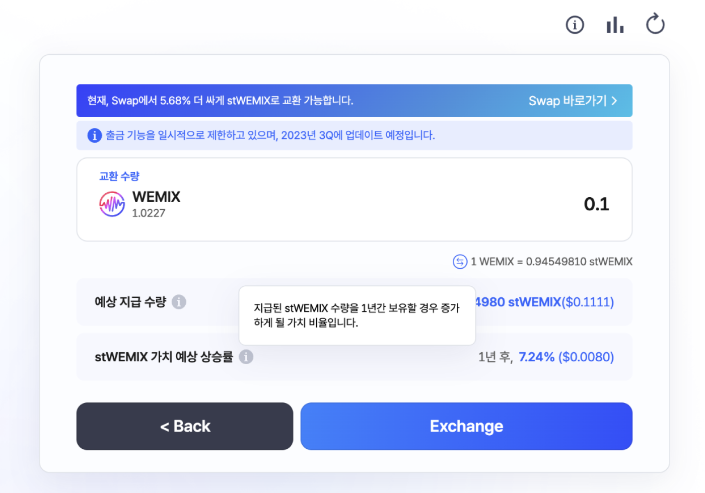 ‘현재, Swap에서 6.65% 더 싸게 stWEMIX로 교환 가능합니다.’라는 LIQUID Staking의 알림 배너가 기억에 남았습니다. stWEMIX를 구매하려고 들어온 사용자라면 Swap에서 더 싸게 교환할 수 있다는 사실을 모르거나 번거롭게 매번 화면을 번갈아 가며 비교해 보아야 했을 텐데, 이런 정보를 제공해 주니 '세심하다'라는 인상을 받았습니다.