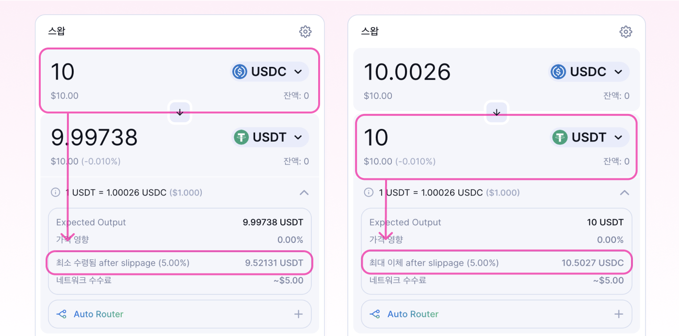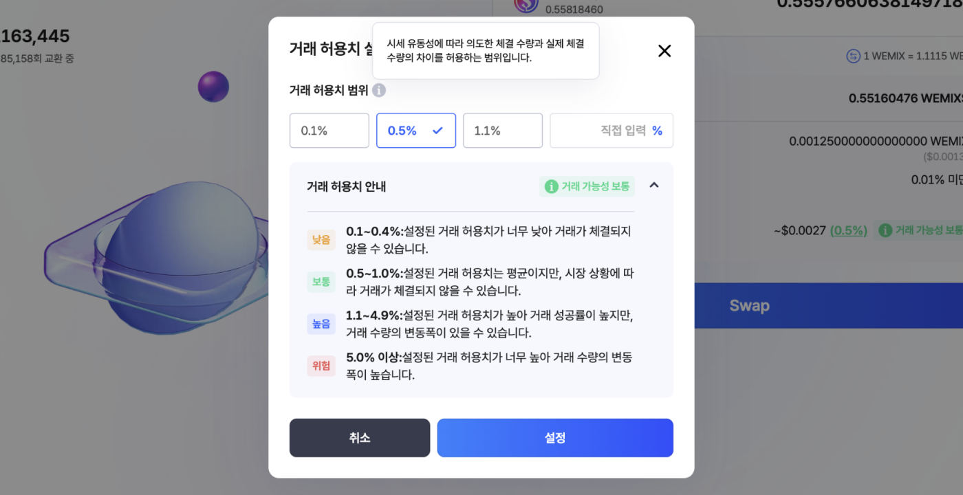 Swap을 포함해 서비스 전반적으로 초기 사용자가 궁금해할 만한 부분에 툴팁이나 가이드 문서로의 진입점을 제공하고 있어 세심하고 친절하다는 인상을 받았습니다. DeFi 서비스 특성상 주식 투자와 마찬가지로 분명히 학습이 필요한 개념들이 있지만 서비스 내에서 제공된 문서와 글들을 찬찬히 공부하면 충분히 이해할 수 있겠다는 생각이 들었습니다. Swap에서는 특히 '슬리피지’를 '거래 허용치'라는 단어로 의역해서 제공하고 , '거래 가능성'이라는 일반적인 용어를 이용해서 개념을 설명하는 것이 초보자 입장에서 이해하는데 도움이 되었습니다.