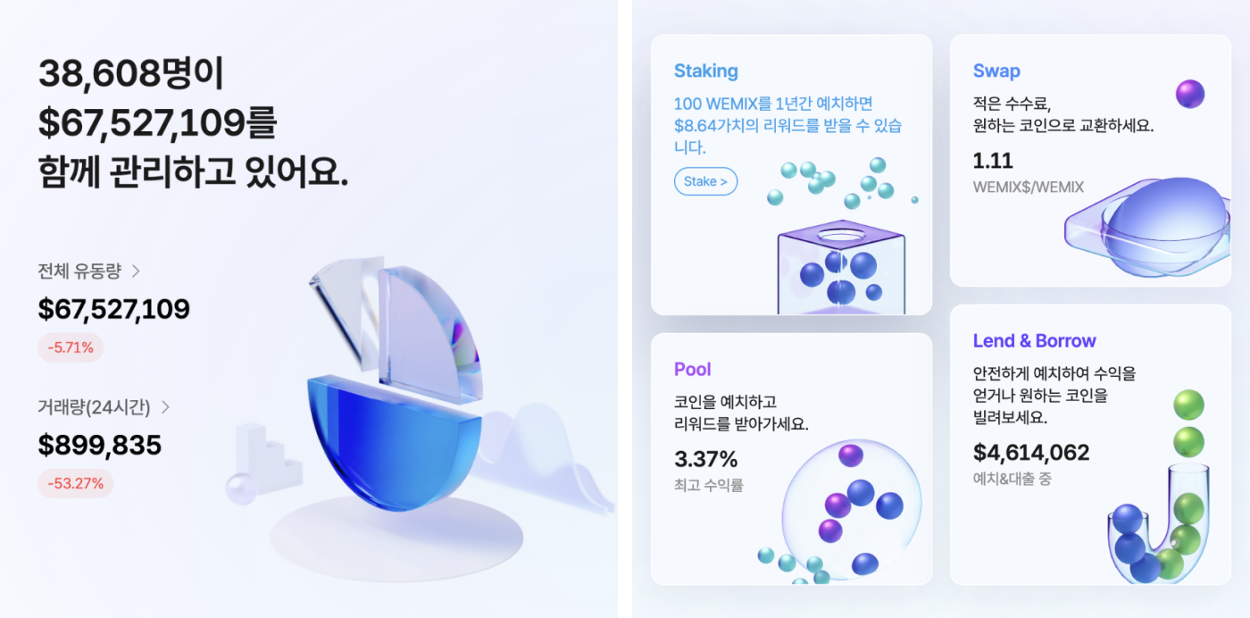 WEMIX.Fi의 첫인상은 흔히 접하던 금융 사이트, 앱과 비교해 보아도 상당히 깔끔하게 느껴졌습니다. 비교를 위해 간략하게 써보았던 여타 DeFi 서비스의 경우 떠오르는 이미지는 ‘어둡다', ‘사이버틱', ‘긱(geek)함'이었던 것에 비해 WEMIX.Fi는 기존 금융 서비스와 유사하게 ‘깔끔하고 투명’하다는 인상이 강했습니다. 각 기능을 표현한 3D 모션 그래픽이 잘 모르는 새로운 개념에 대한 거부감을 줄여주었다는 의견도 있었습니다.