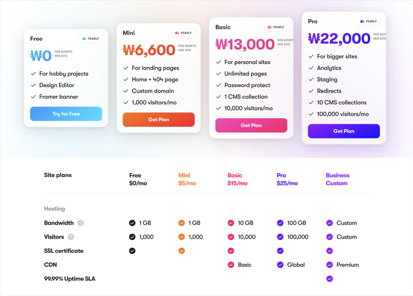 다만 각 상품을 통해 얻을 수 있는 리워드를 이해하는 것이 어려웠습니다. 기존 Sass 사이트들은 아래와 같이 Pricing 비교 화면에서 각각의 상품의 특징을 표로 정리해서 보여주고 있습니다. 이런 형태의 화면처럼 예치기간, 리워드 종류, 추천 대상 등을 한눈에 보기 쉽게 제공한다면 사용자들이 더 편리하게 상품을 고를 수 있지 않을까 하는 생각이 들었습니다.