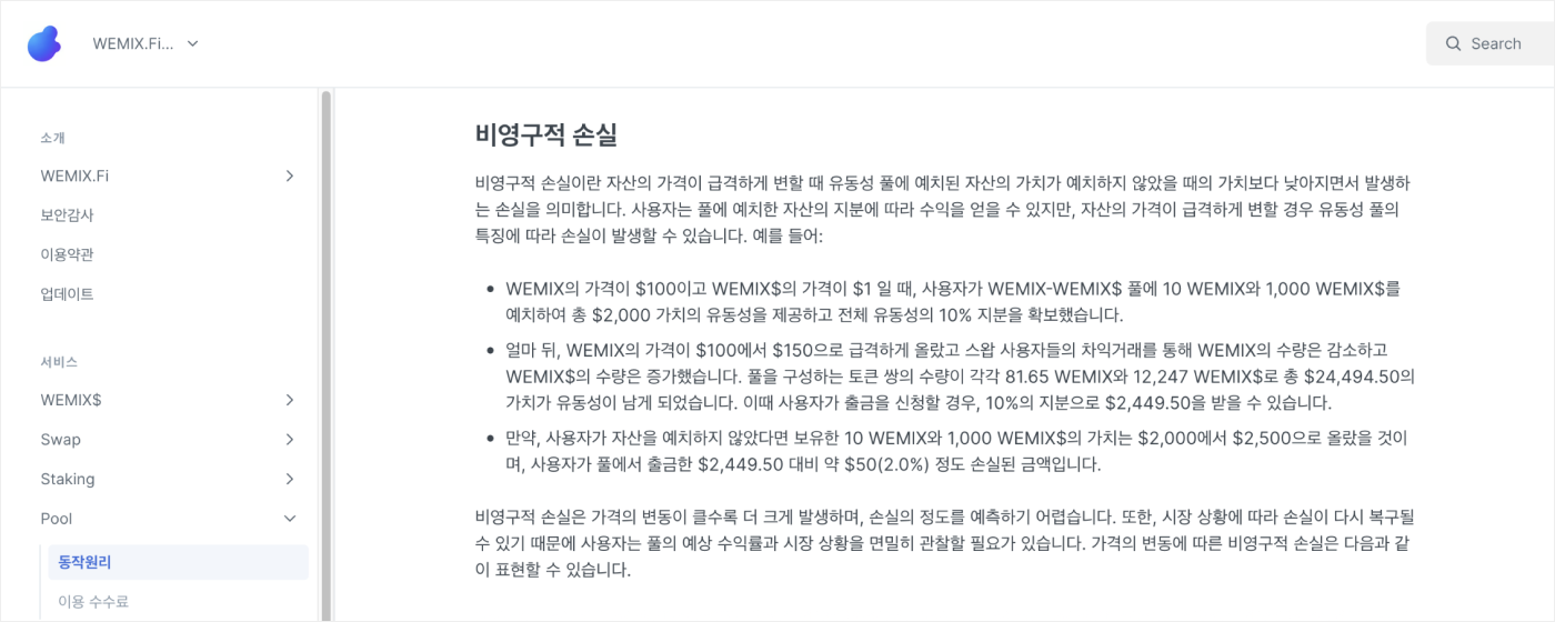 Pool 이용가이드와 예상 수익률 등 정보는 쉽게 찾을 수 있었지만 Pool 예치 시 발생할 수 있는 손실에 대한 설명은 찾기 어려웠습니다. ‘비영구적 손실‘은 Pool예치 시 발생할 수 있는 잠재적인 손실로 예치 전 꼭 이해가 필요한 개념이었음에도 불구하고 홈 화면 하단에서 가이드 문서 링크로 들어간 뒤, 동작원리를 찾아 읽은 뒤에야 발견할 수 있었습니다. DeFi 상품 투자는 처음이라 상품의 안전성 및 위험성에 대한 정보가 궁금했는데, 해당 정보의 접근성이 다소 부족하다고 느꼈습니다.