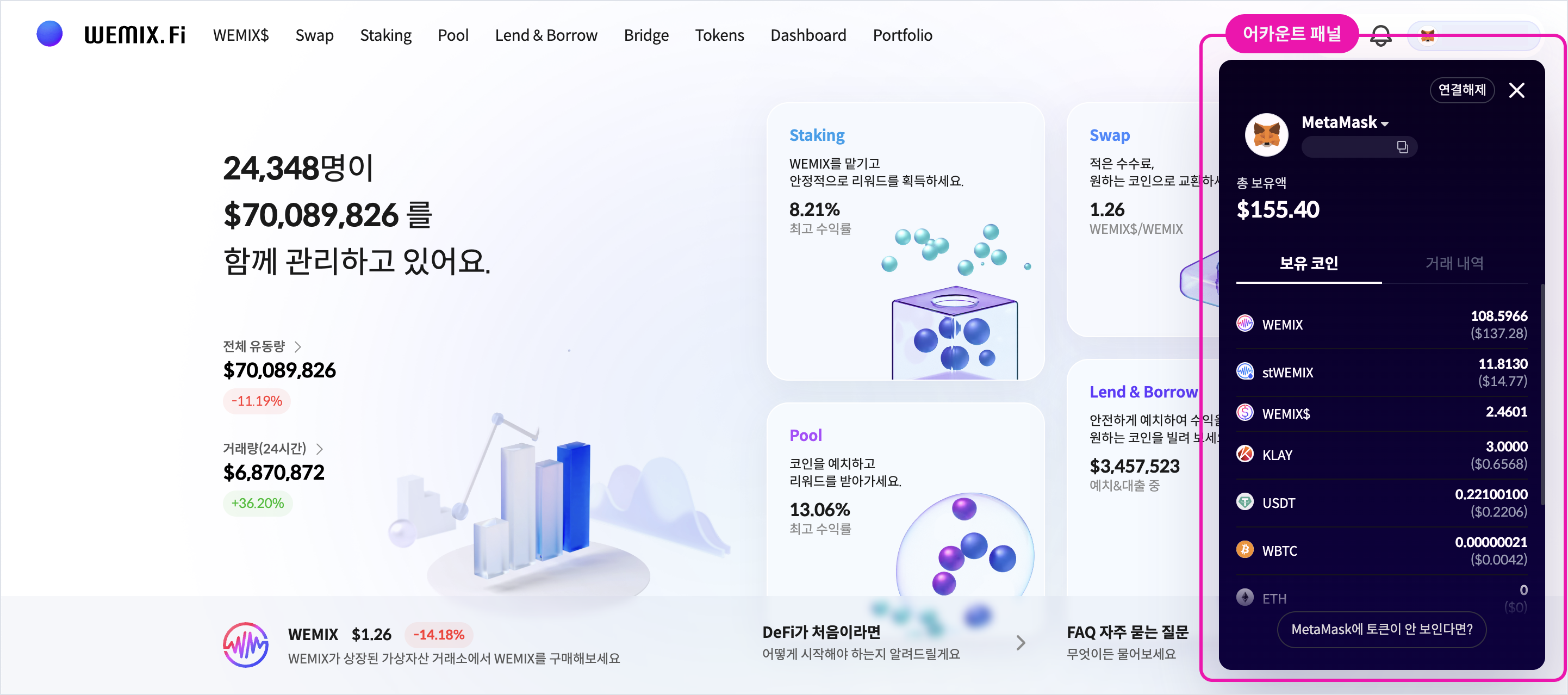 ‘이용자의 정확한 자산 현황을 전달하는 것’은 DeFi 서비스에서 가장 기본이 되는 요소 중 하나입니다. 변동성 높은 마켓 특성상 이용자가 코인의 이동 흐름을 반영한 자산 상황을 분명히 알아야만 변수를 예측하고 유리한 결정을 내릴 수 있기 때문입니다. 그래서 WEMIX.Fi팀은 서비스 내에서 이용자가 자신의 자산을 명확히 파악할 수 있는 장치들을 마련했습니다.