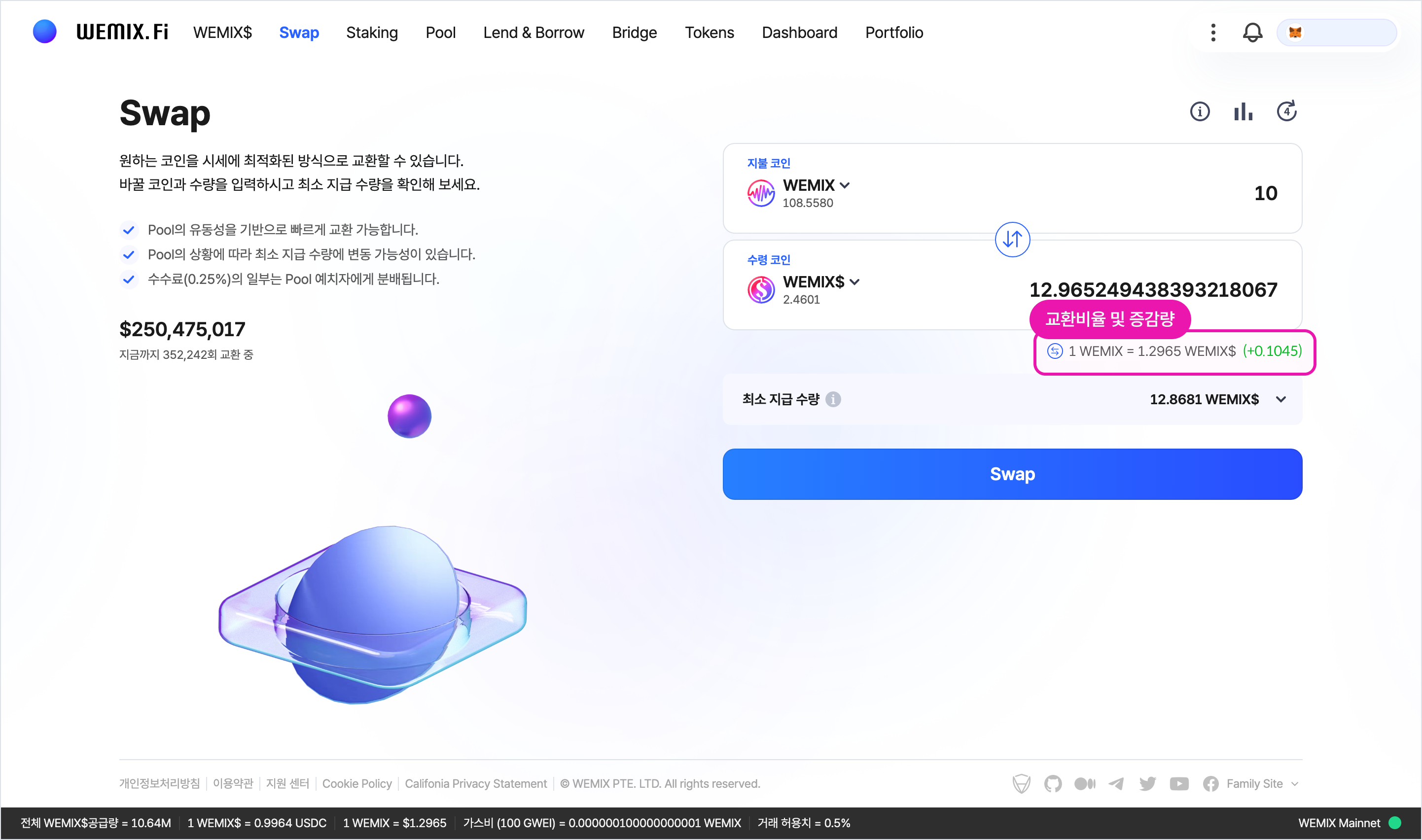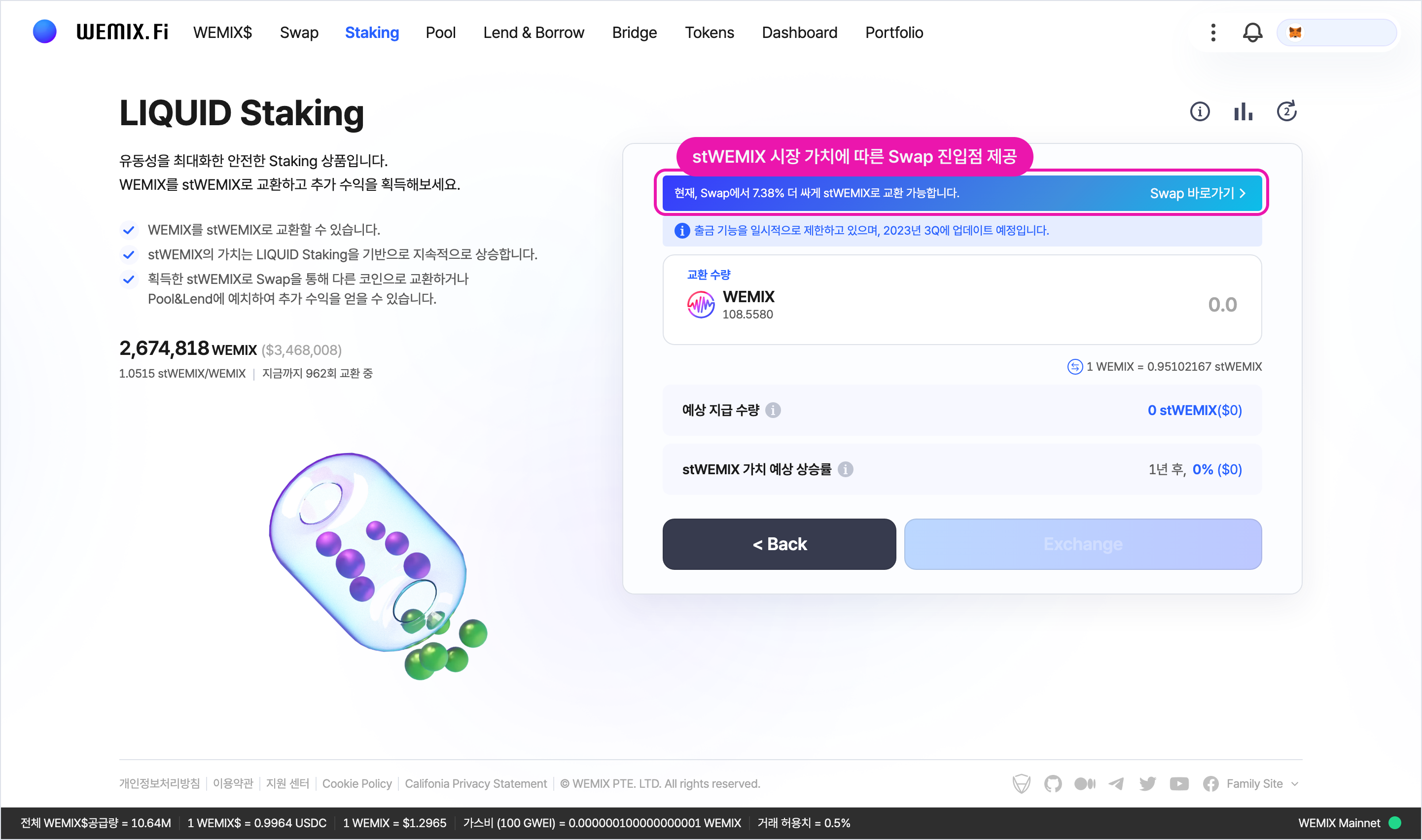 LIQUID Staking을 통한 stWEMIX의 발행 가치가 시장 가치보다 높을 경우, WEMIX.Fi는 화면 상단에 Swap을 통한 교환비율을 알리고 Swap 서비스로 바로 이동할 수 있는 기능을 제공합니다. LIQUID Staking을 위해 진입한 이용자의 본질적인 목적이 이윤 창출이라는 점을 이해하고, 더 나은 결과를 낼 수 있는 Swap을 이용하도록 유도하는 것이죠.