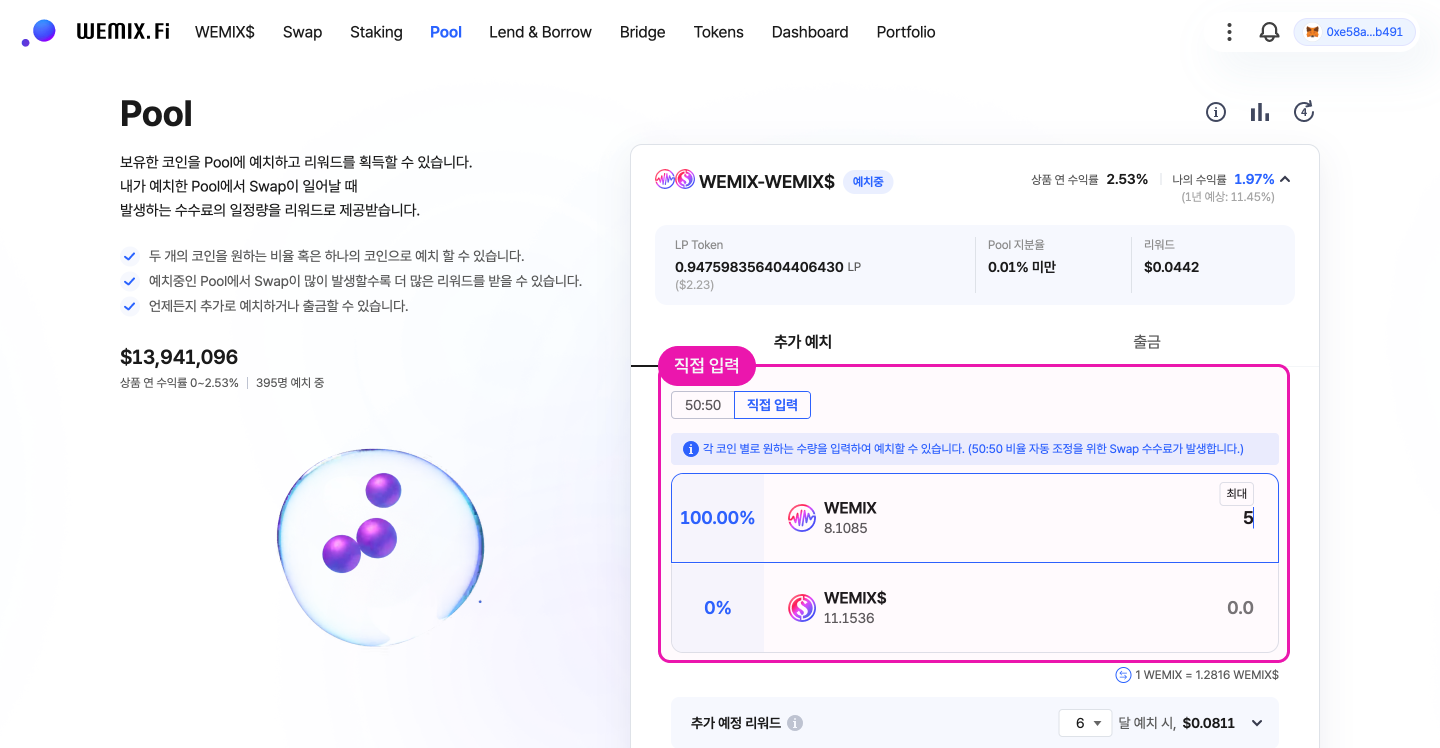 WEMIX.Fi의 Pool 서비스는 ‘직접 입력(Manual Input)’ 기능을 통해 이용자가 별도의 과정 없이 하나의 서비스 내에서 곧바로 자산을 운용할 수 있도록 합니다. 복잡한 준비나 계산은 시스템이 전담하고, 이용자는 간편히 서비스 이용 목적을 달성할 수 있도록요.
