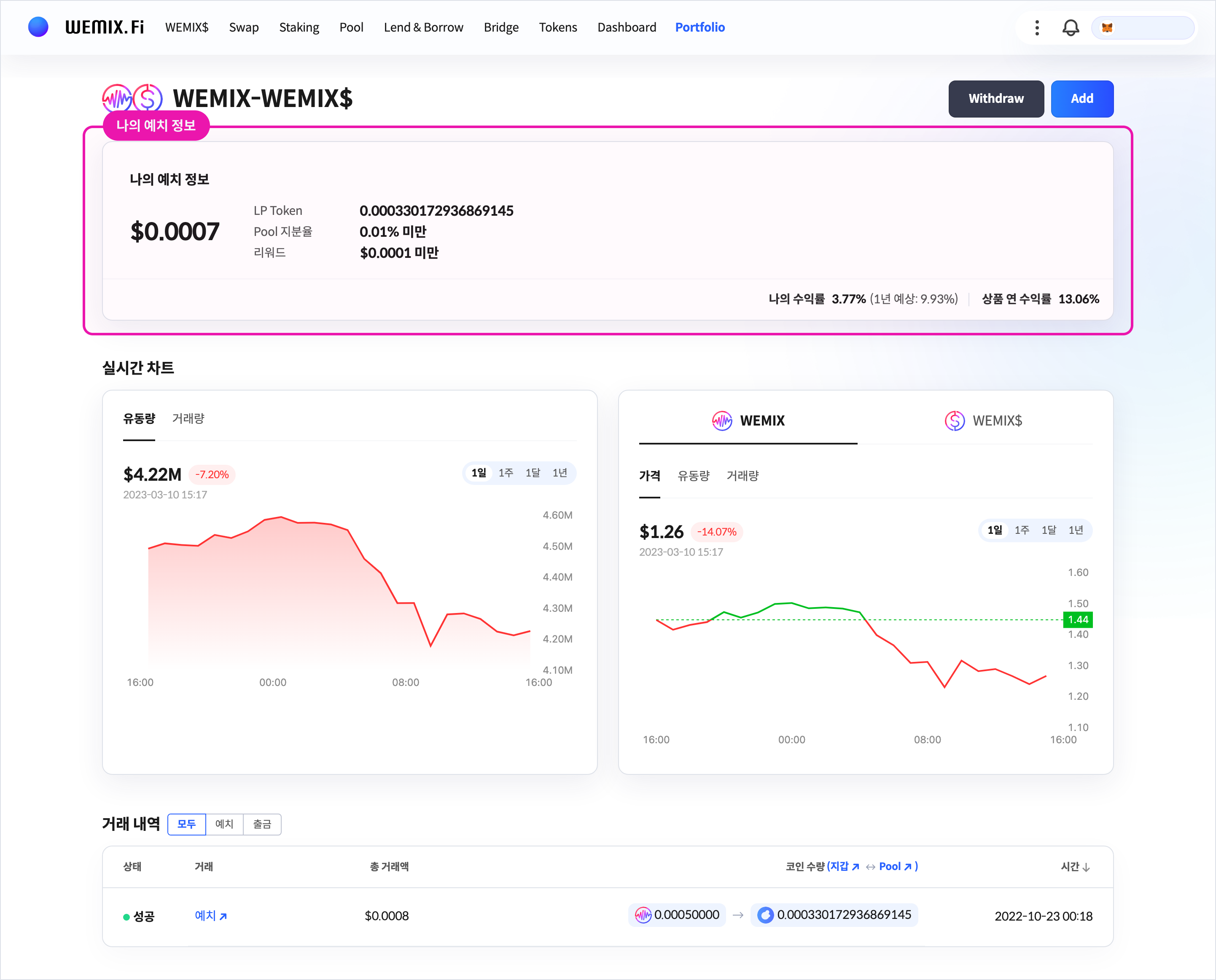 이용자가 Portfolio에서 각 예치 상품의 상세 페이지로 진입했을 때, 시선이 먼저 닿는 화면 상단에는 ‘나의 예치 정보’가 위치합니다. 이용자는 이를 통해 LP(Liquidity Provider) Token, Pool 지분율, 리워드, 이용자의 수익률과 상품 연 수익률을 확인할 수 있죠. 또한 바로 하단에 제공되는 ‘실시간 차트’에서 각 코인의 유동량과 거래량의 기간별 추이를 살펴볼 수 있습니다.