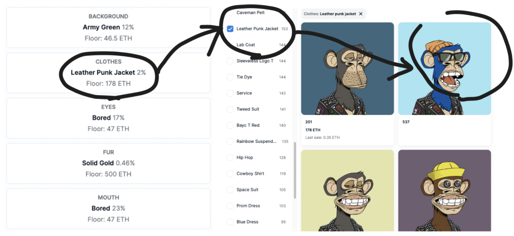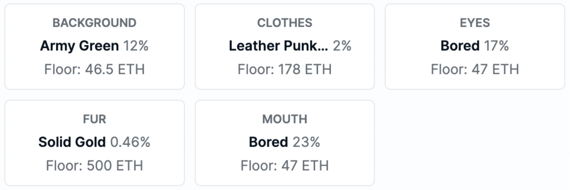 이런 희귀성은 바로 재화적 가치로 치환됩니다. 오픈씨에서는 개별 프로퍼티의 희귀도와 함께 각 프로퍼티의 바닥가를 보여줍니다. 아래 예를 보면 국방색 배경 프로퍼티는 46.5 ETH 가치가 있고, 펑크스타일 가죽 재킷 프로퍼티는 178 ETH에 거래가 되고 있습니다. 금빛 털을 가진 NFT는 500 ETH로 엄청난 가치가 있네요.