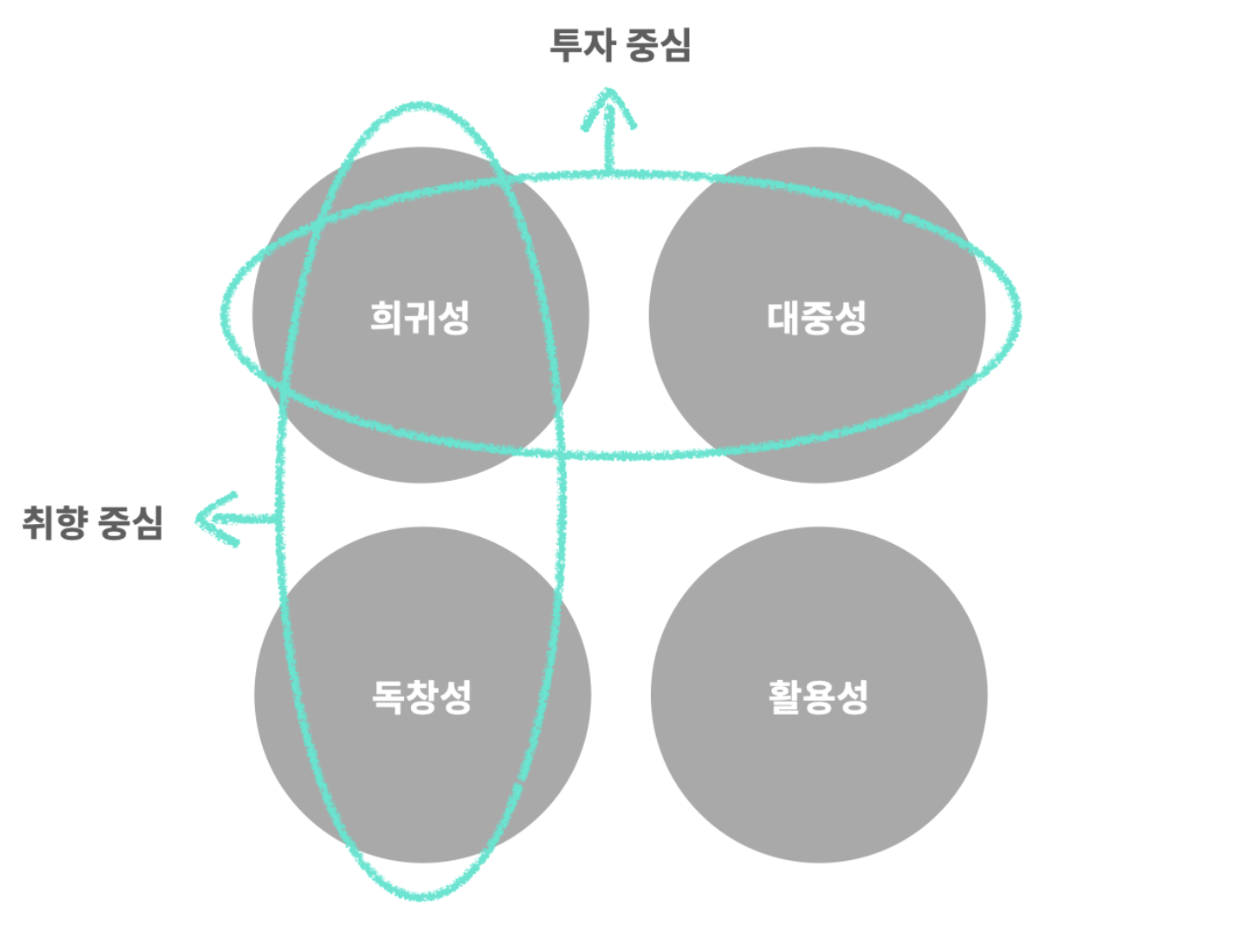 프로퍼티의 특징을 희귀성, 대중성, 독창성, 활용성으로 구분해 볼 수 있습니다. 희귀성과 대중성은 투자에 연관된 프로퍼티라고 할 수 있습니다. 희귀함은 높은 가격을 만들 수 있고 대중적인 특성은 거래량을 늘릴 수 있기 때문입니다. 특정 아티스트를 예로 들기는 좀 그렇지만 음악으로 치환해서 생각해 보면 쉽게 이해할 수 있습니다. 희귀성과 독창성은 취향을 드러내는데 더 가까워 보입니다.