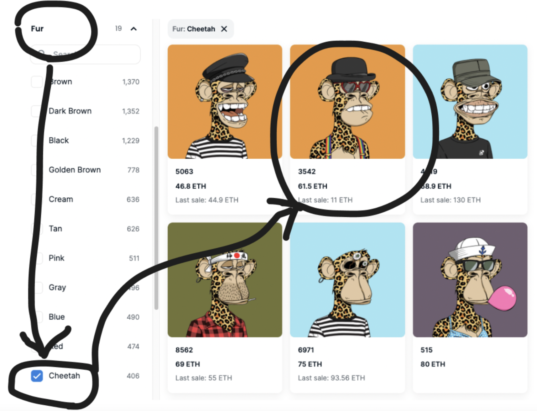 가치 상승이 기대되는 물건을 찾는 과정과 유사합니다. 골동품 도자기를 구매하는 경우, 작가, 제작 연도, 재료…등등 가격에 영향을 미치는 요인을 파악하는 것이 중요하겠지요. 이 사용자가 BAYC를 구매할 때는 어떤 프로퍼티가 희귀성이 있고 프로퍼티에 따라 얼마나 가격 차이가 있는지 확인하며 탐색을 해 나갈 것입니다.