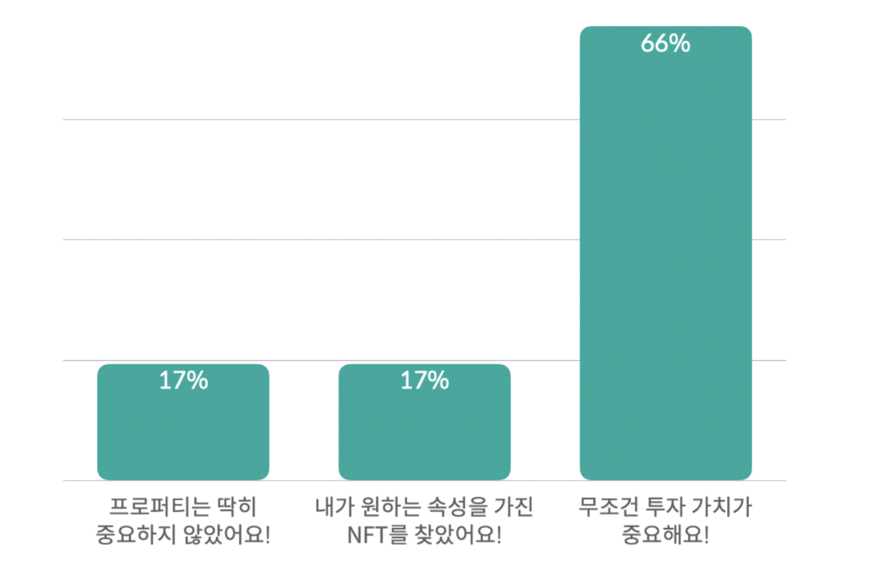 NFT 구매 시 프로퍼티를 확인했다고 응답한 사용자 중 66%에 해당하는 사용자가 프로퍼티는 “무조건 투자 가치" 중심으로 파악하기를 원한다고 응답했습니다. 이는 NFT가 아직은 소비 상품이 아니라 투자 상품이라는 것을 드러내며, 프로퍼티를 설계할 때에도 투자 가치를 명확하게 드러내는 것이 중요하다는 것을 보여줍니다.