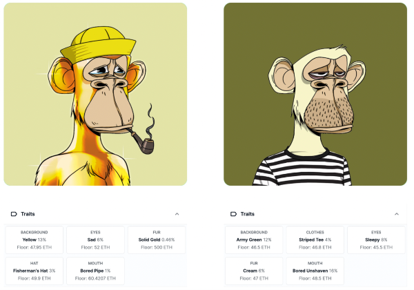 알려진 NFT 컬렉션, BAYC(Bored Ape Yacht Club)의 NFT 두 개를 비교해 볼까요? 아래 두 NFT는 시각적으로 단번에 구별되는 외형을 가지고 있습니다. 왼쪽은 노란색 배경에 파이프를 물고 눈물을 머금은 모양새고 오른쪽은 줄무늬 티셔츠를 입고 있네요. 그 내용은 ‘노란 배경', ‘슬픈 눈'과 같은 프로퍼티로 또는 “국방색 배경", “줄무늬 티셔츠", “졸린 눈"과 같은 프로퍼티로도 제시되고 있습니다.
