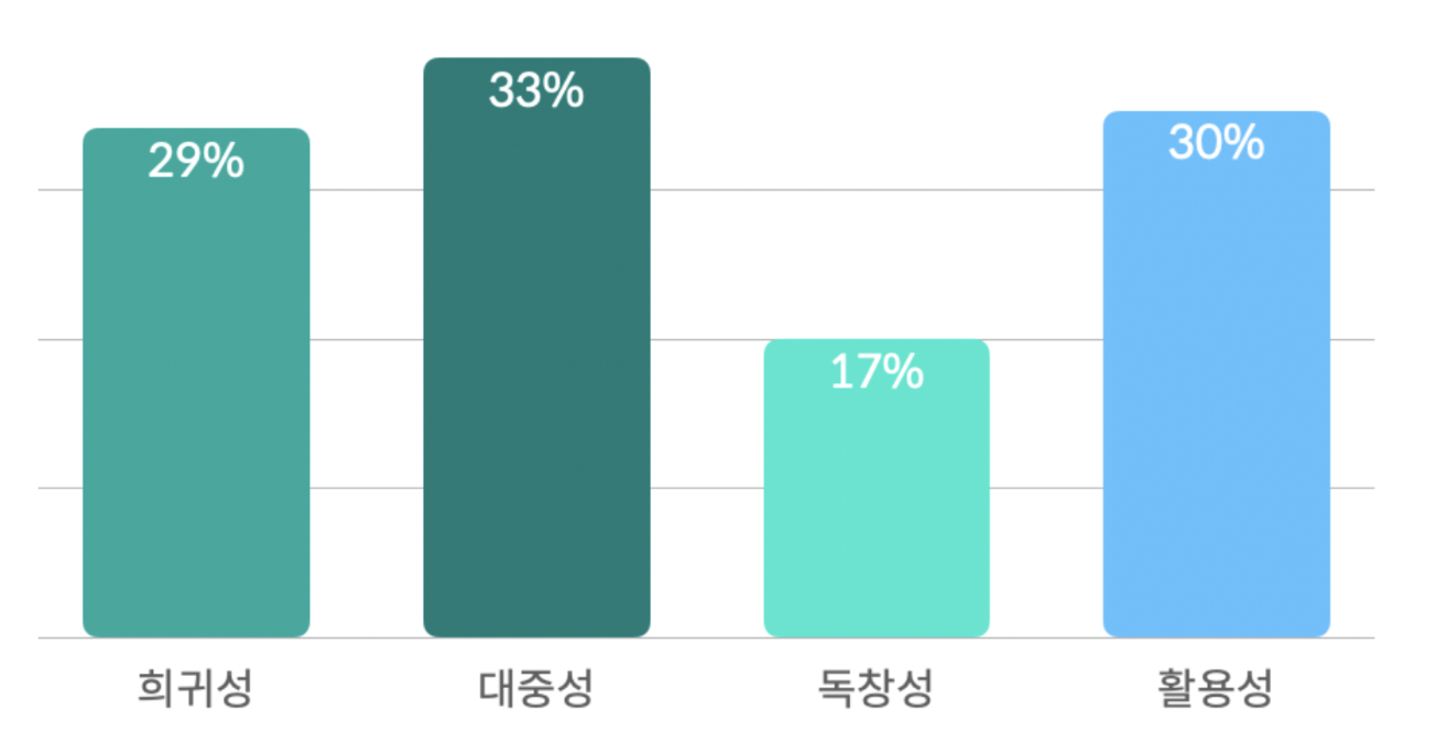 NFT를 어떤 특수한 목적에 활용하는 유틸리티성을 제외하면 희귀성과 대중성이 합쳐진 투자 목적의 특성이 사용자에게 중요하게 받아들여지고 있음을 알 수 있습니다.
